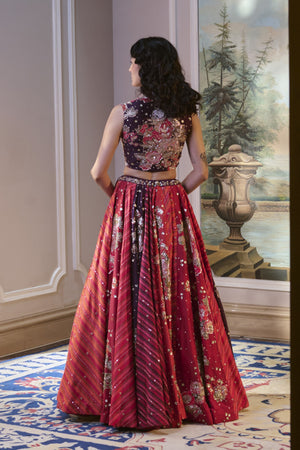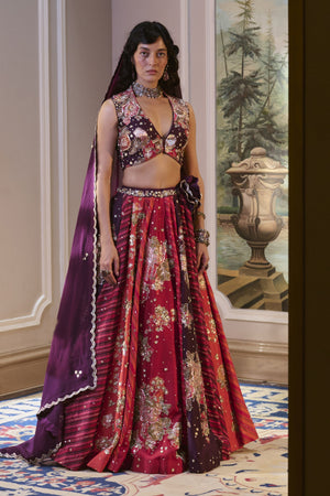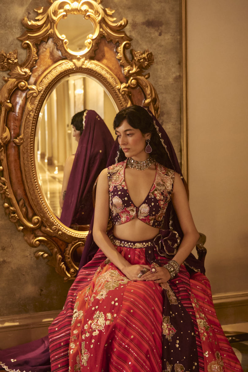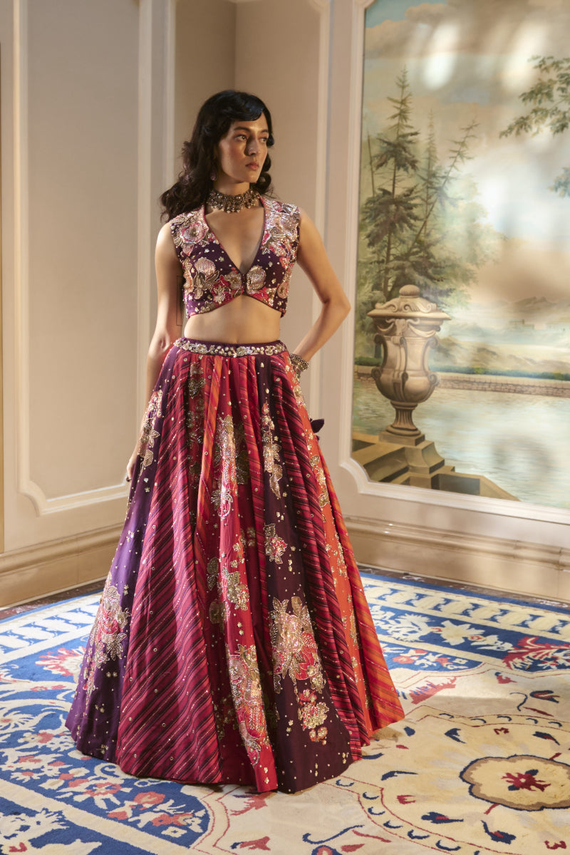 A vibrant lehenga set in striking shades of bright orange, pink, wine purple, and crimson, crafted from a harmonious blend of leheriya and floral prints. The lehenga is richly hand-embroidered with sequins, cutdana, zari, and resham work, exuding festive grandeur. It is paired with a signature-cut statement blouse adorned with delicate hand embroidery, and a scallop-edged net dupatta embellished with scattered buttis for an elegant finishing touch.