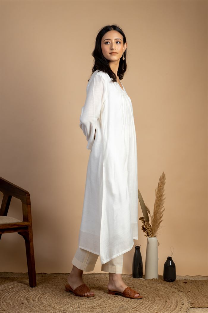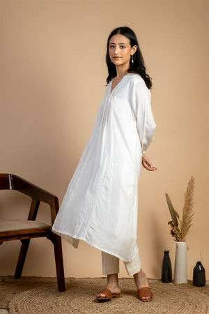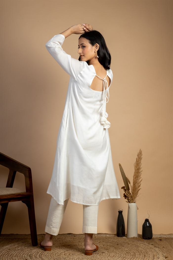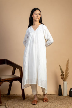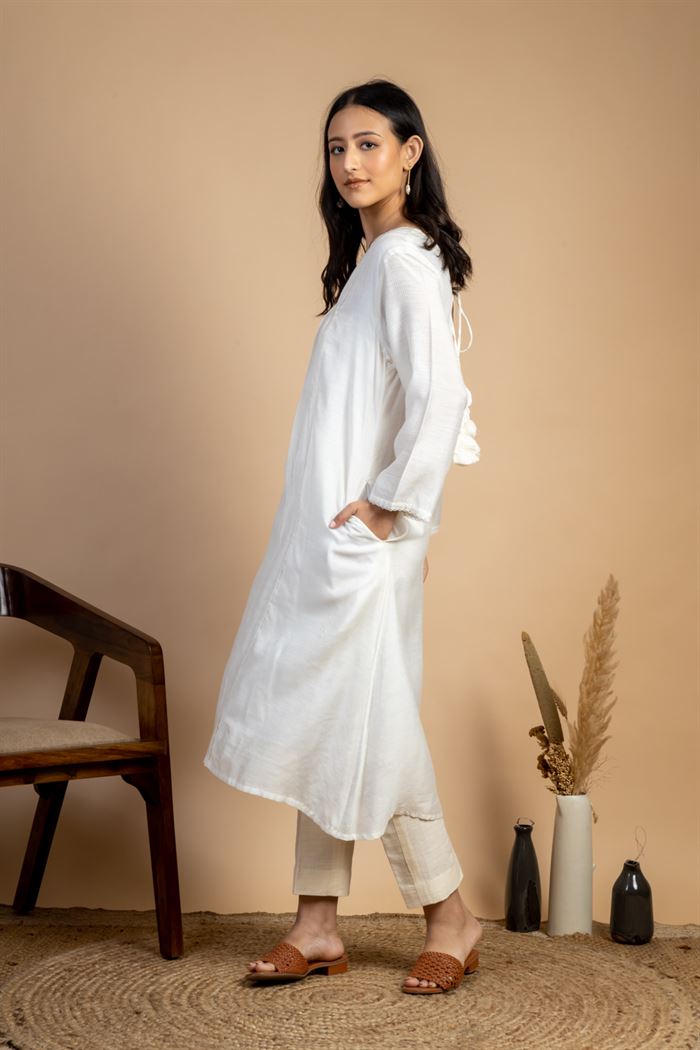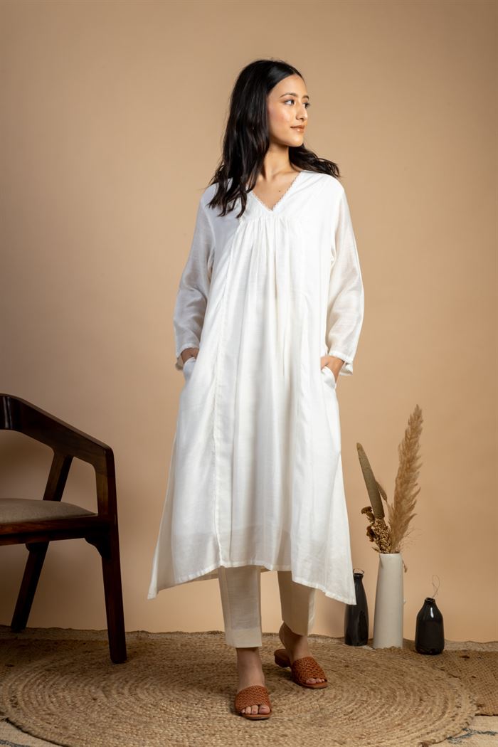 Our Bhavya dress is made in the beautiful Maheshwari Silk fabric. This classic off-white front panel dress has gathers detail on the front and is embraced with intricate lace detail. It also features crochet flower tassel at the back. This dress is super comfortable and elegant. Can also be worn as a kurta paired with pants