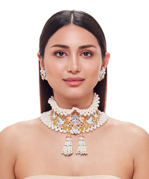 Pastel peach and blue meenakari man – bird necklace set with a big crystal, birds, twigs, flowers, leaves, pearl jaal and pearl tassel details.