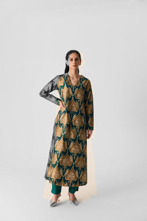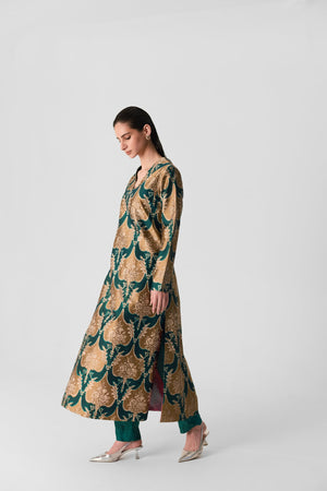 This elegant V-neck long kurta is crafted from luxurious silk, featuring the timeless Biyu print, created through traditional hand-block printing.