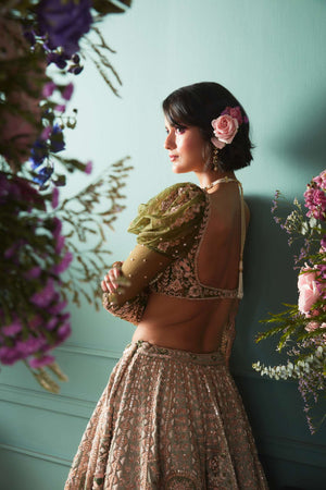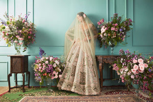 Presenting an elegant green raw silk lehenga with intricate zardosi work. The lehenga set includes a net dupatta and blouse with pearl detailing. The set is crafted with the finest materials to complete the royal bride's look.