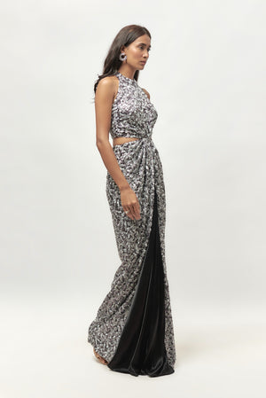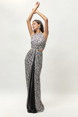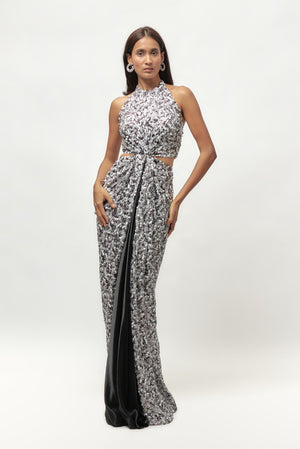 The Black and White Sequin Halter Neck Cut-Out Gown is a show-stopping piece that effortlessly blends drama and sophistication. The halter neck adds a chic touch, while strategically placed cut-outs enhance the gown's bold, modern silhouette. Perfect for making a statement at any evening event, this gown is all about high-impact glamour.