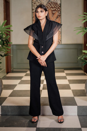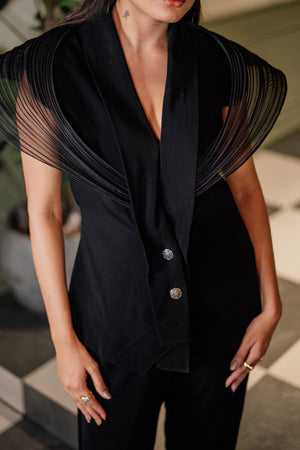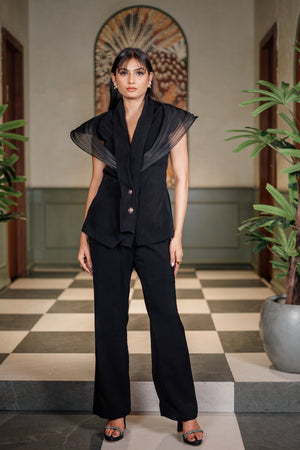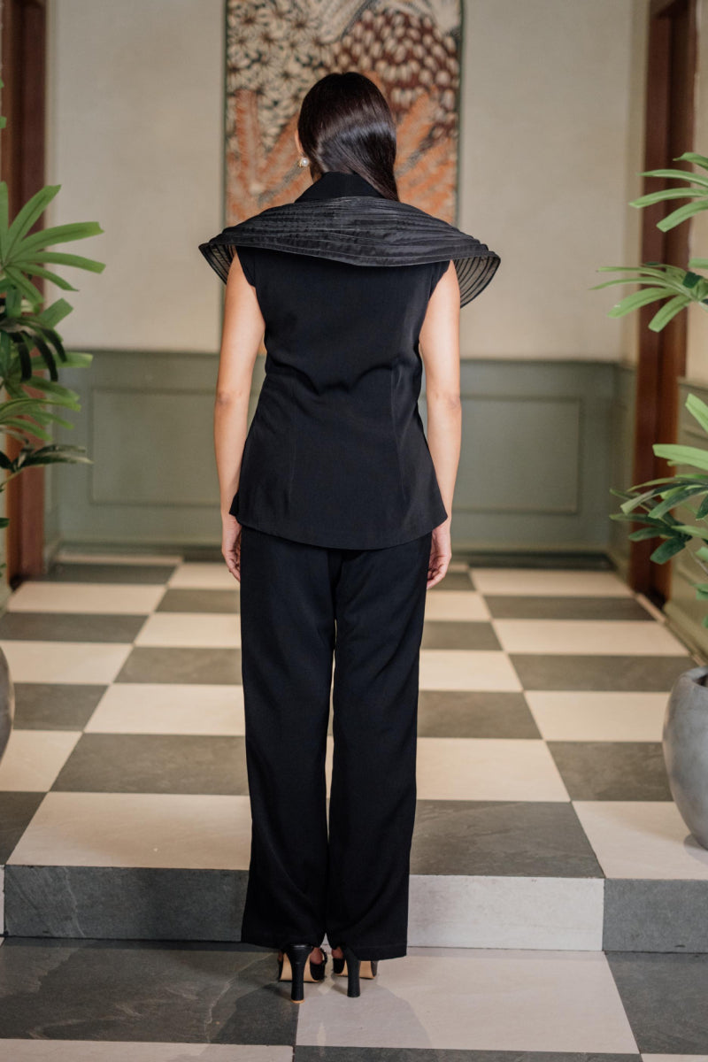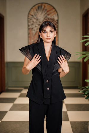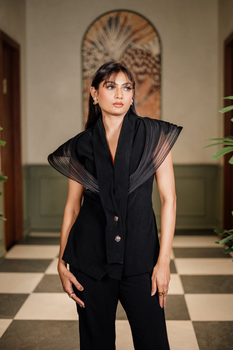 Step into your power with this Ensemble — a dramatic fusion of futuristic tailoring and classic black sophistication. This striking top features a structured sleeveless jacket with sculptural, wing-like sheer pleats at the shoulders, creating an avant-garde silhouette that commands the room. it’s designed for women who lead with elegance and aren’t afraid to make a statement.