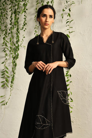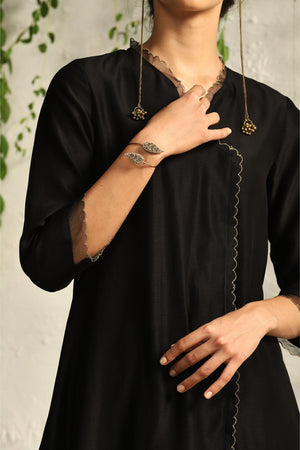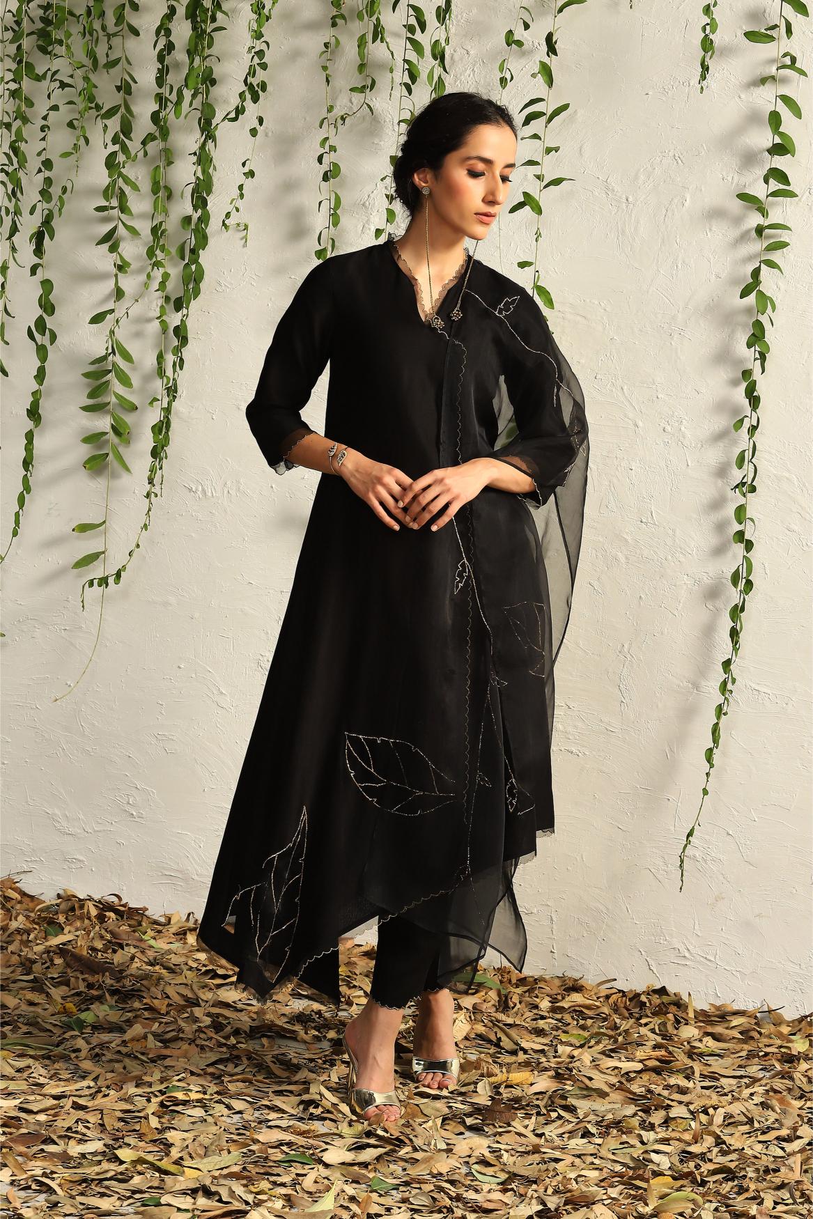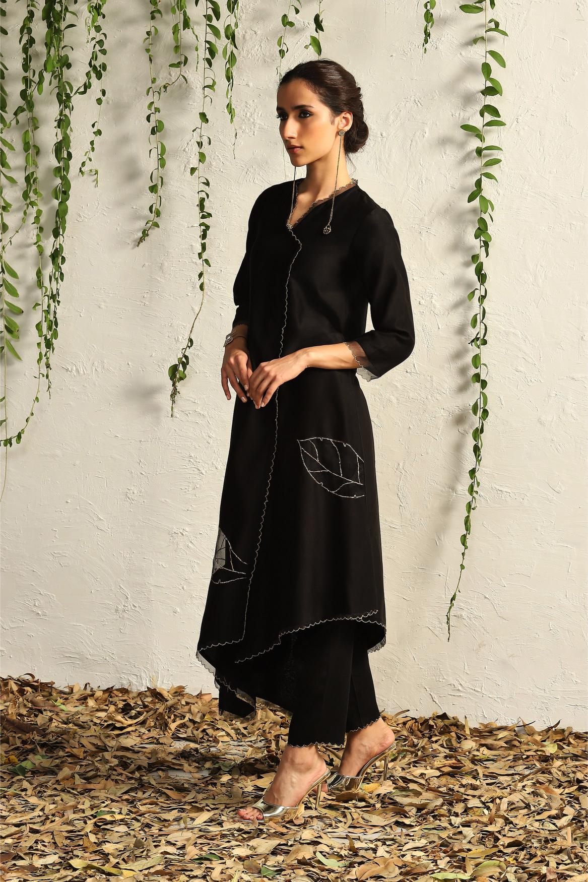Contemporary and edgy silhouette, feather touch pure organza patchwork with intricate nakshi hand embroidery, scalloped border all along, this black chanderi kurta set has it all to make it one of your most prized possessions.