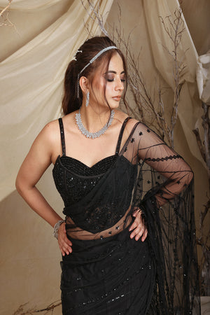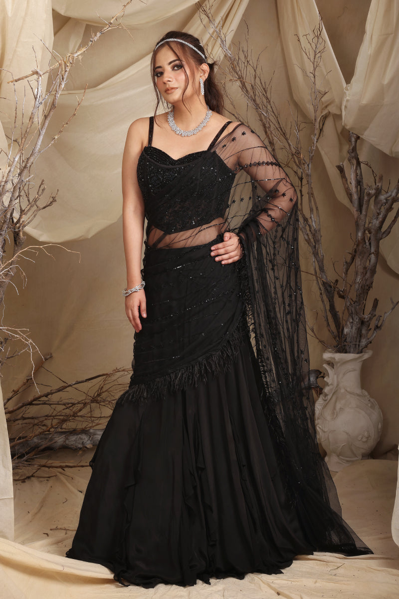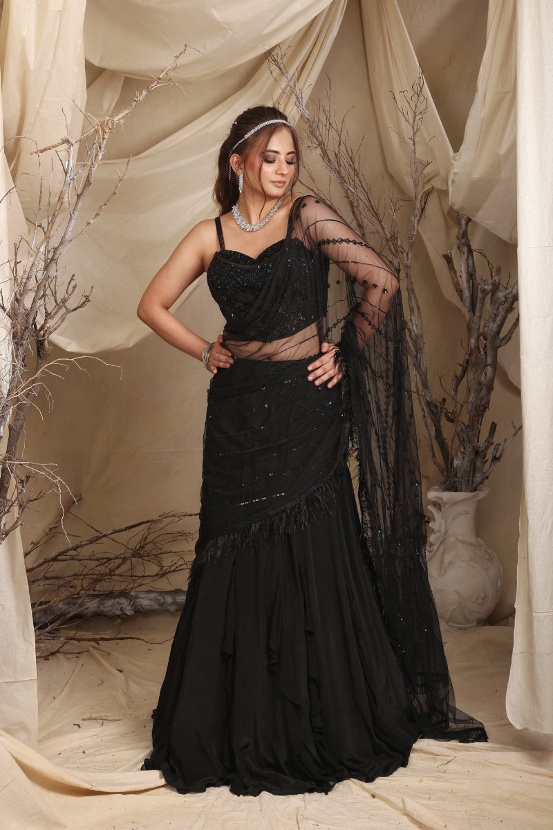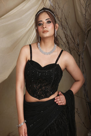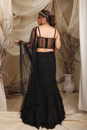 Black corset blouse paired with a ruffle skirt in crepe & a tulle drape featuring cutdana, sequins, crystal work