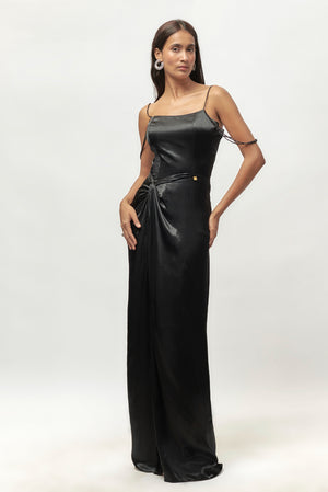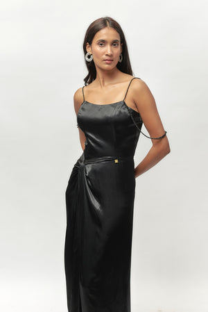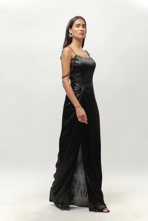 The Black Corset Embellished Strappy Drape Dress in Gajji is a captivating fusion of structure and fluidity. The corset detailing sculpts the waist, while the delicate straps and draped design create a graceful, yet daring silhouette. Perfect for a glamorous evening, this dress combines modern allure with timeless elegance.