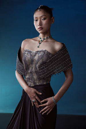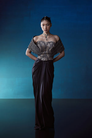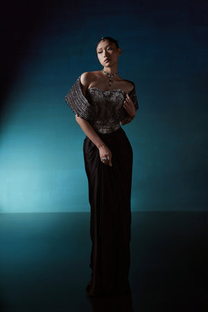 Black corset top with golden hand embroidery, with attached with shoulder boning cape and plain satin drape skirt