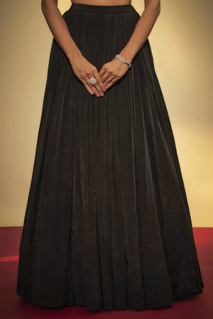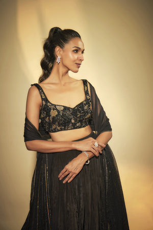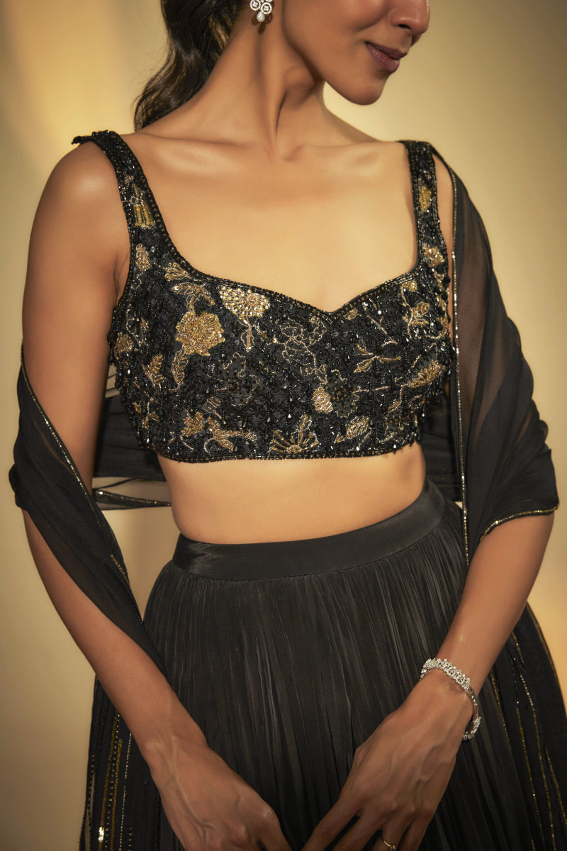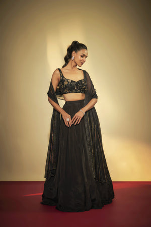 Black Lehenga Crafted From Pure Crepe, Featuring Exquisite Hand-Embroidered Detailing- Cutdana, Sequince, Zardozi For A Touch Of Elegance And Sophistication.