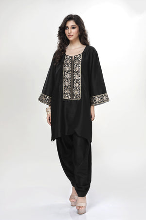 Black Dogri Kurta With Black Dhoti Salwar And Silk Organza Dupatta