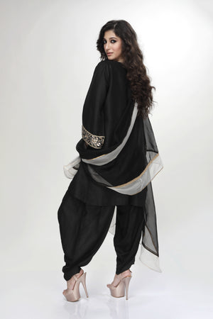 Black dogri kurta with black dhoti salwar and silk organza dupatta .