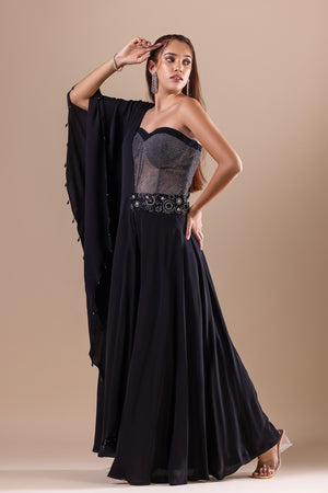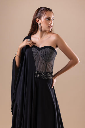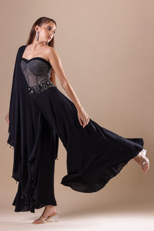 Black jumpsuit made of double georgette featuring crystal and Swarovski embroidery.