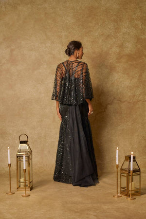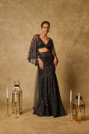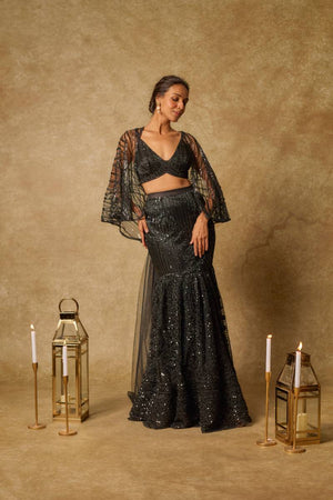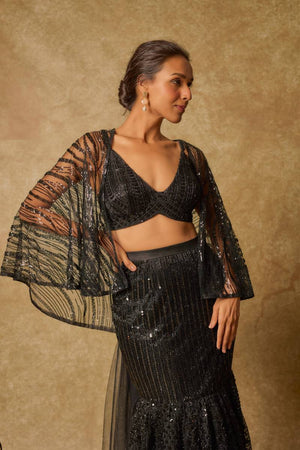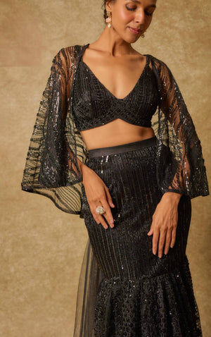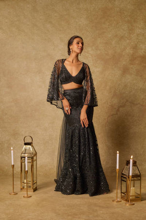featuring black mermaid embroidered skirt in tulle nad mashroo silk, with matching embroidered blouse and embroidered cape