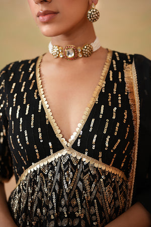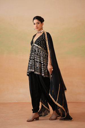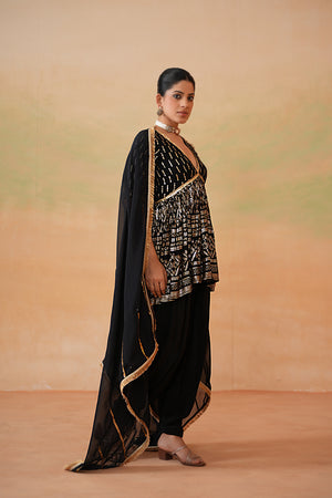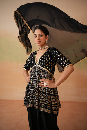 Deepika Chadha's stunning Black georgette embroidered fabric peplum kurti beautifully adorned with golden borders. The black crepe fabric dhoti salwar adds a touch of sophistication to your look. it is paired with organza dupatta, embellished with golden borders which keeps you comfortable all day long and is perfect for wedding and festive season.