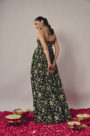 Featuring a black gown in chinon base with hand embellishments. Accentuate it with statement jewellery and heels for a festive occasion or cocktail ceremony.