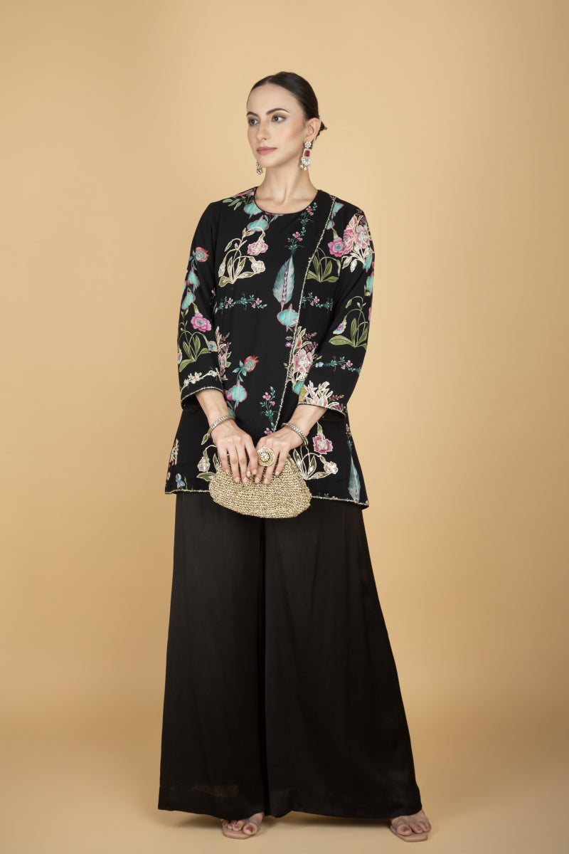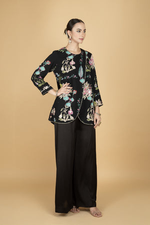 Featuring a black floral printed overlay top in cotton silk, enhanced with delicate embroidery, paired with coordinating modal silk pants for a chic and contemporary silhouette.