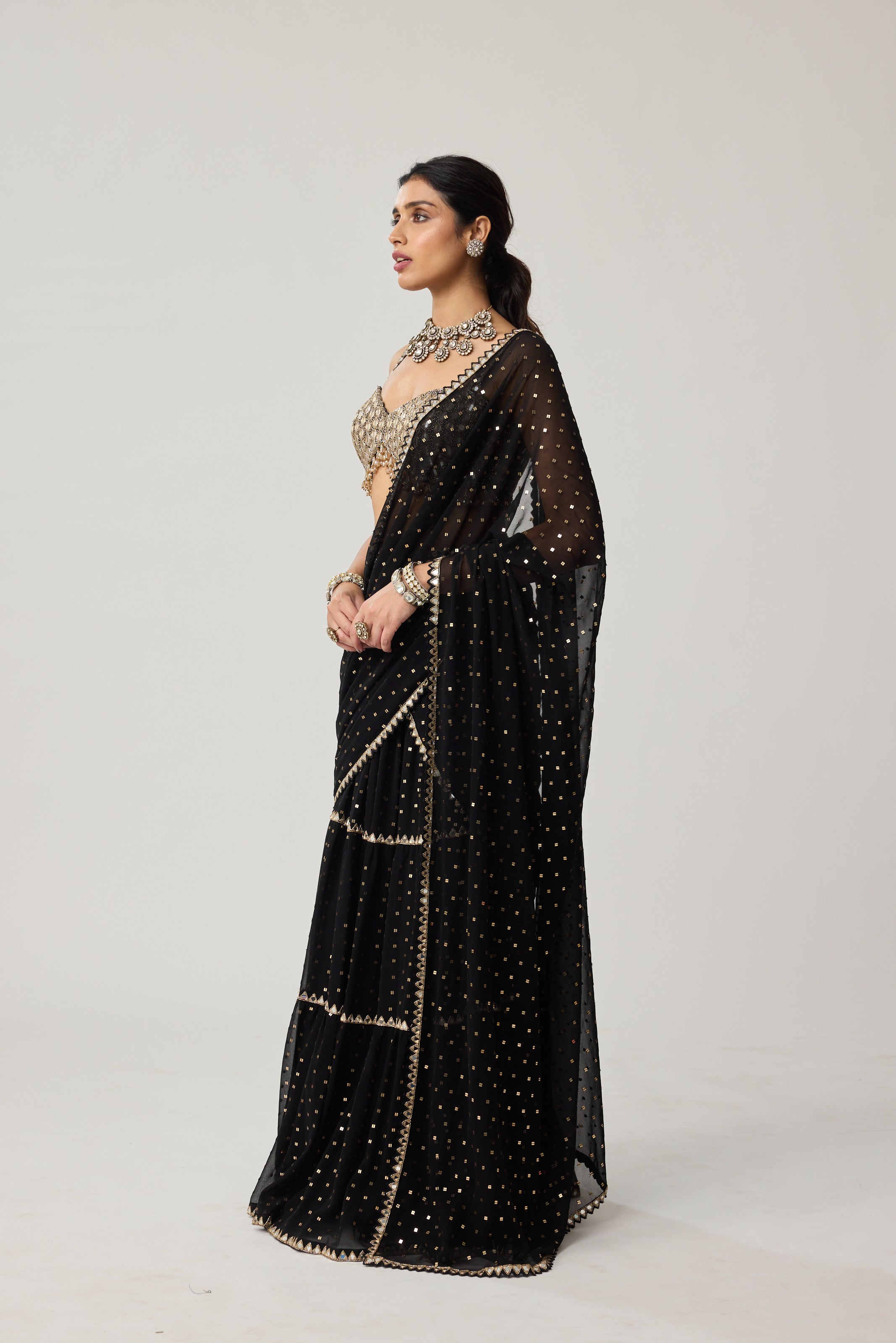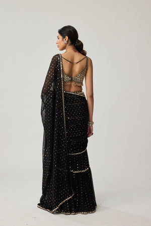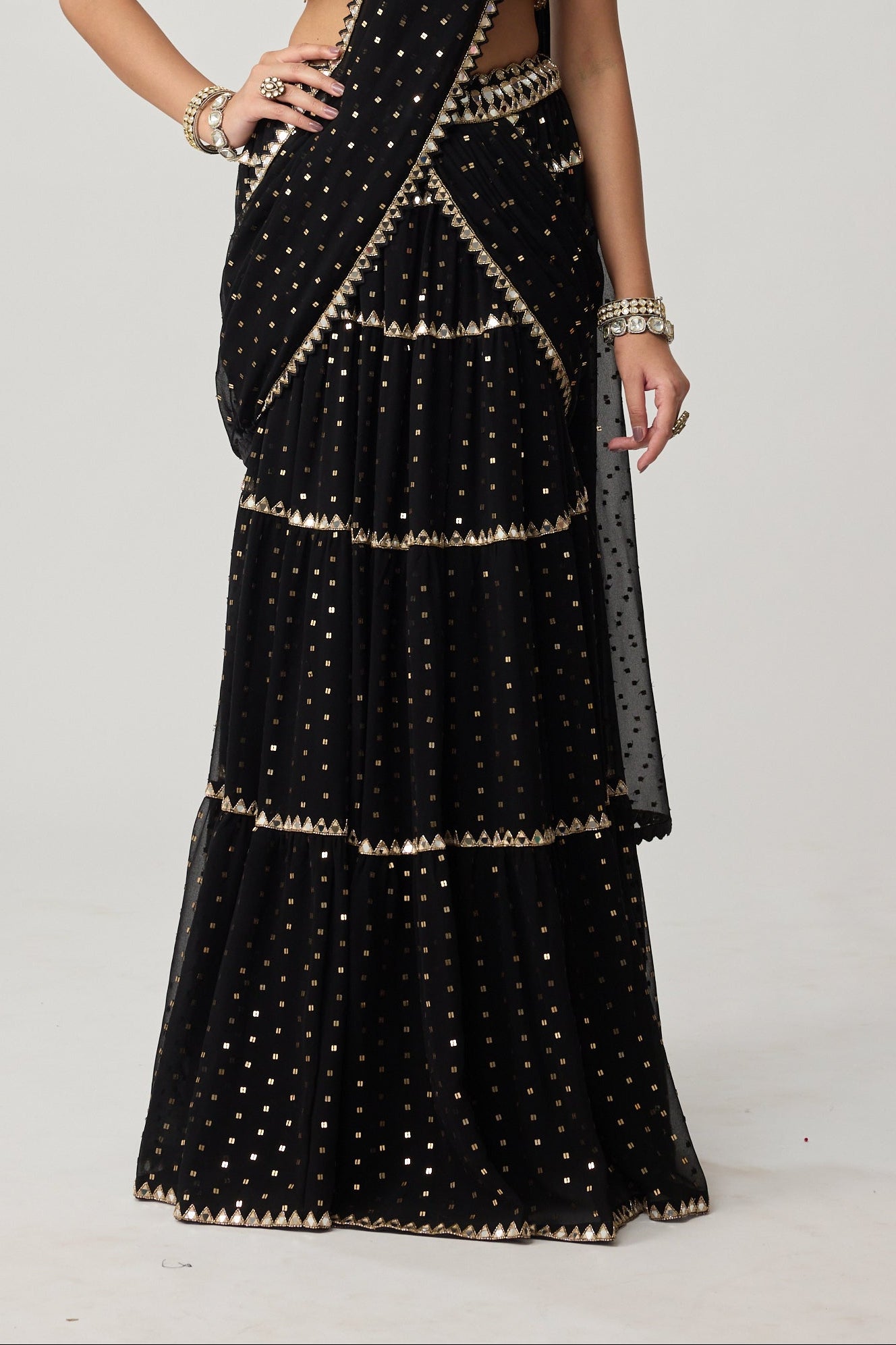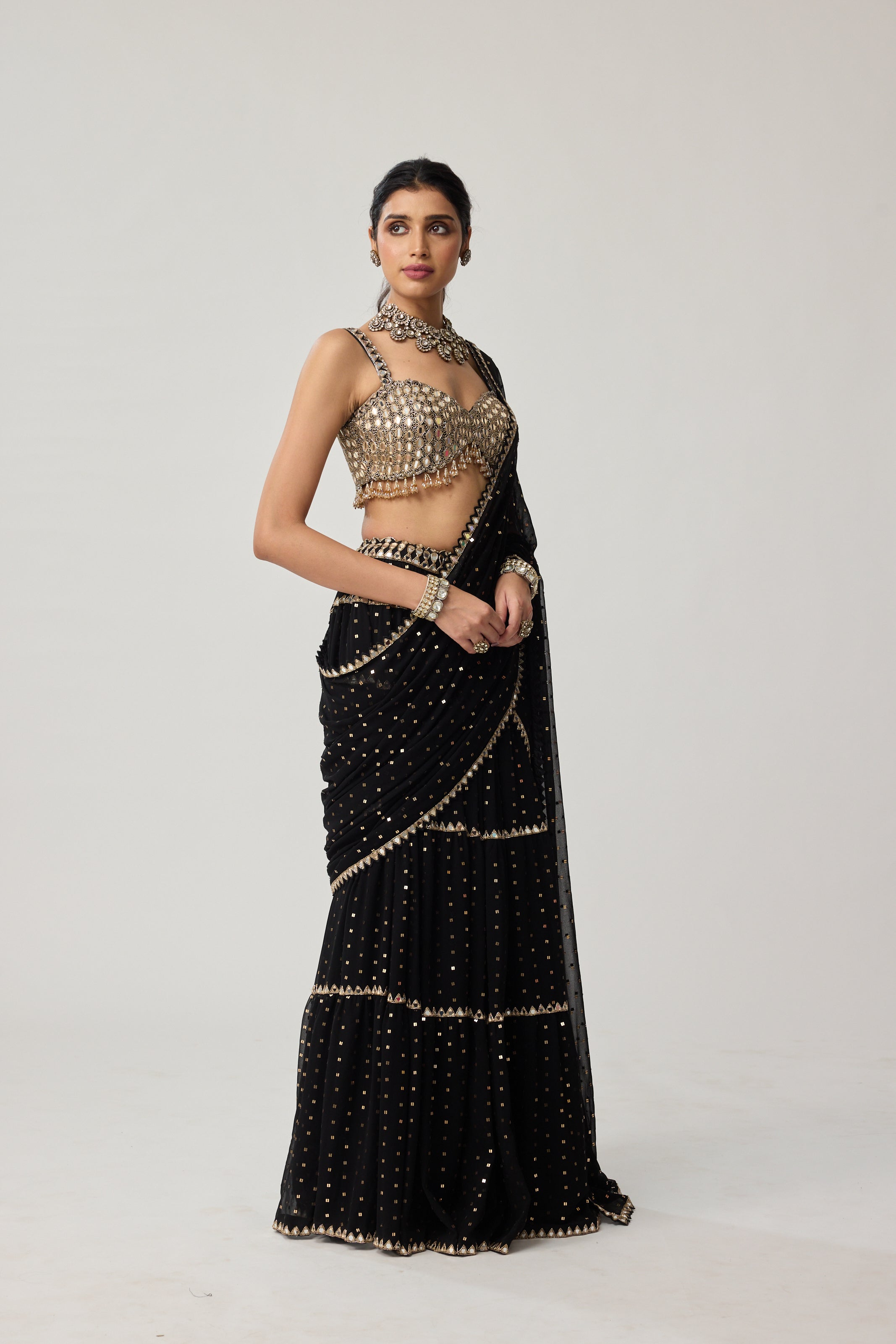 Black Georgette Multi-tier Saree with Real Hand Cut Mirror Embroidered Sleeveless Blouse.
