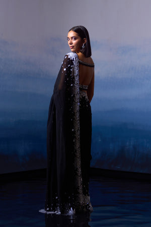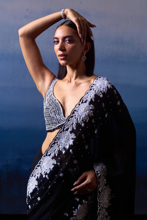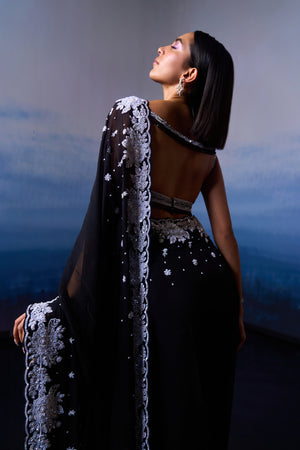 A black georgette saree embroidered with pearl white sequins, crystals and bugle beads.