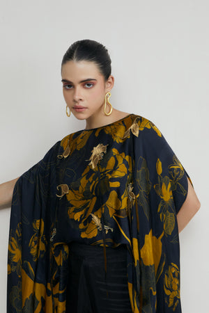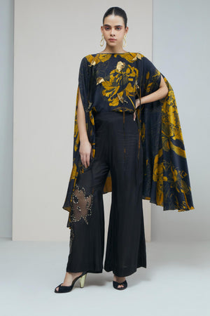 Black Gold Bloom Print Zari Applique Cape With Sheer Applique Boot Cut Pants