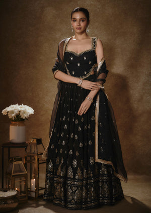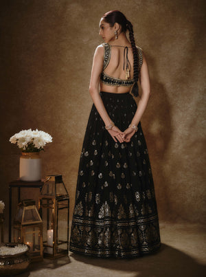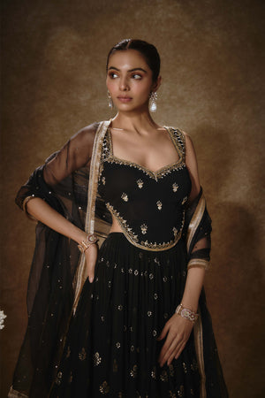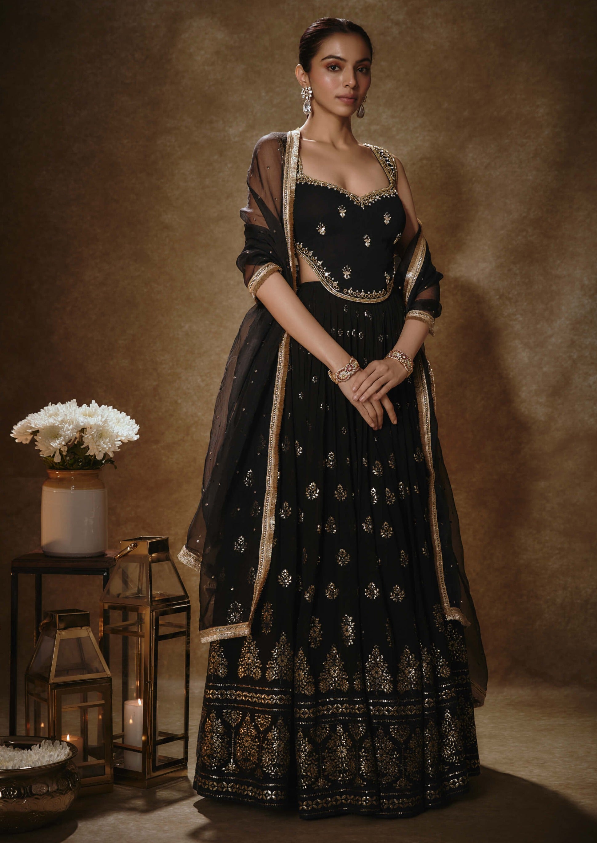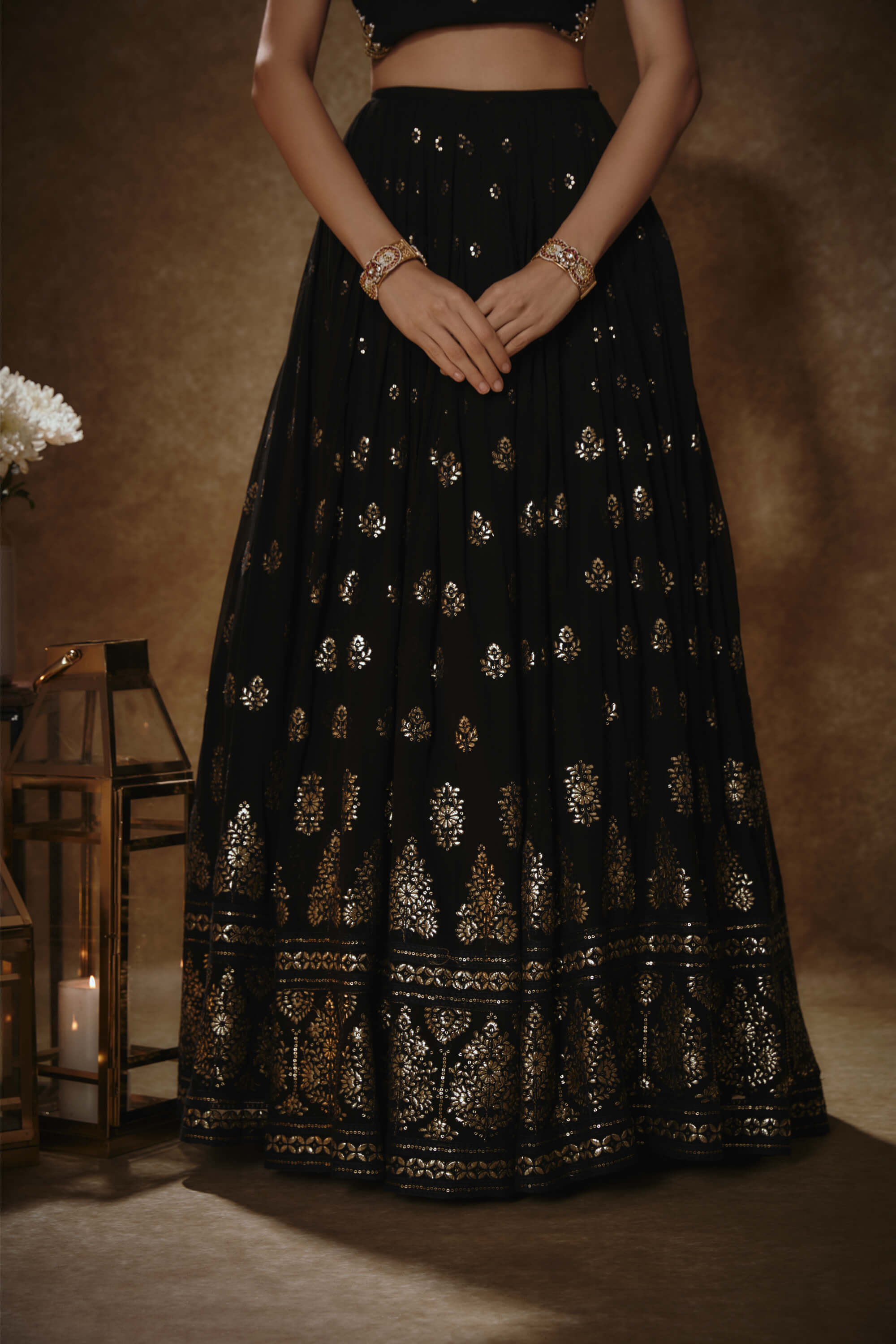 This look features a black gota lehenga set. The lehenga comprises of machine embroidered light gold gota, sequin and threadwork kalis. Teamed with a matching sequin and cutdana hand embroidered blouse. An organza dupatta with a tassel border and badla buttis completes the look. Cancan & pockets are included.