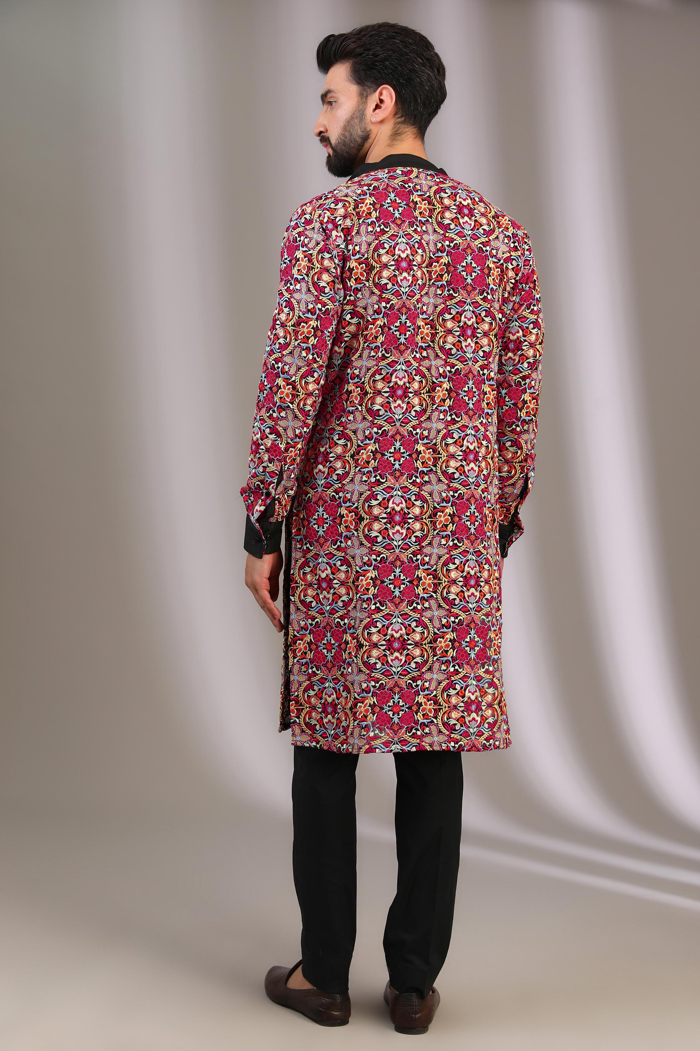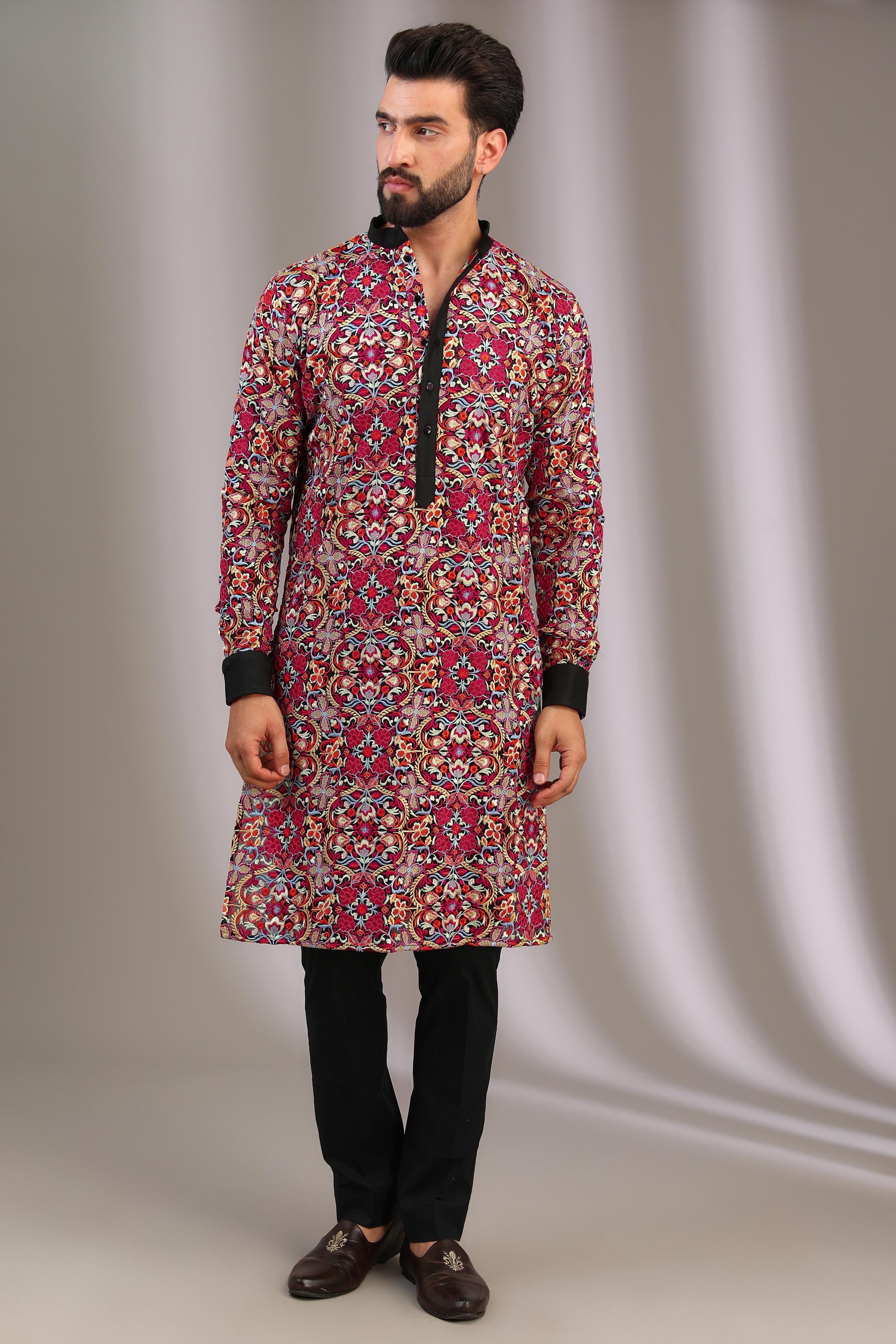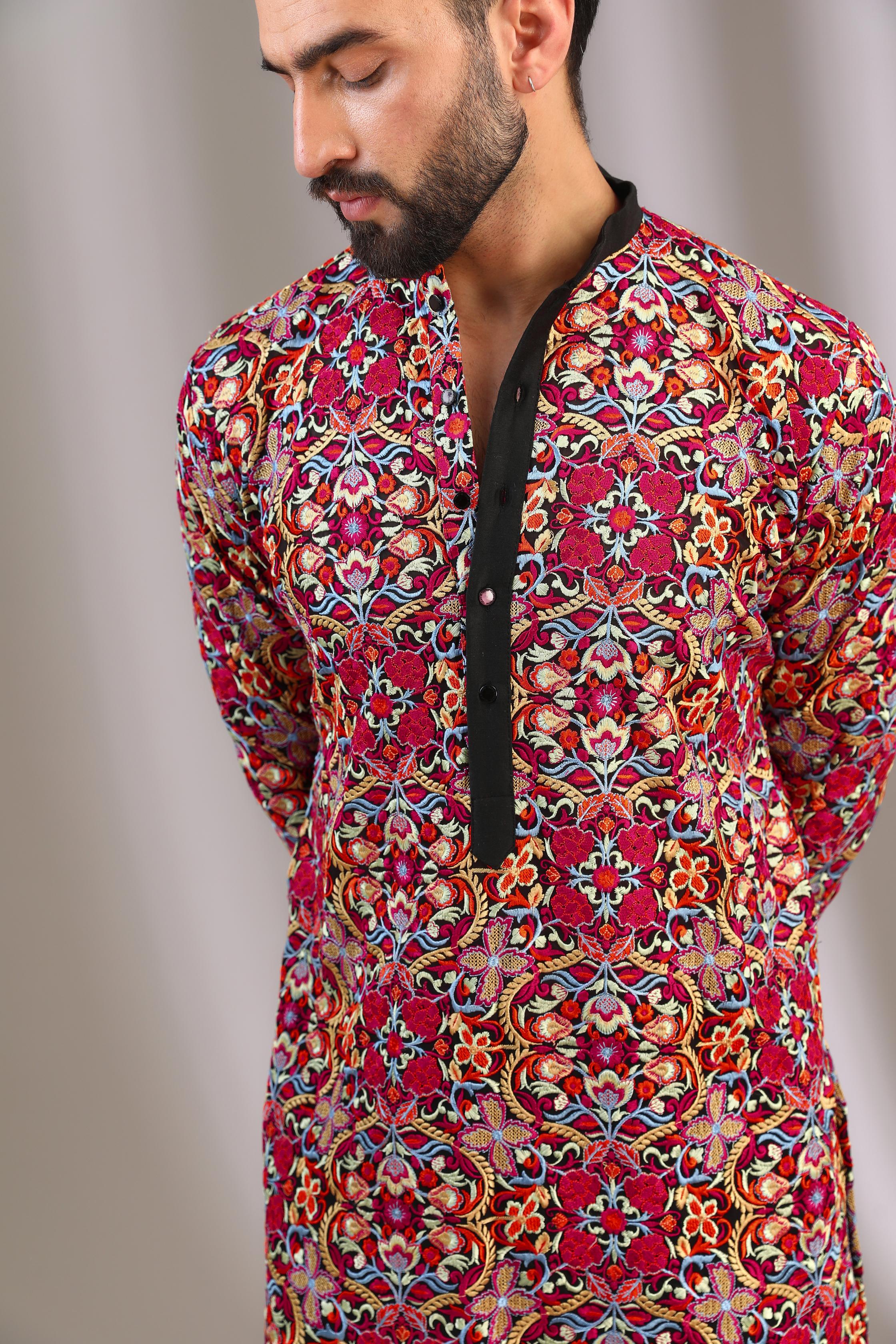 BLACK GORGETTE MULTI COLOR SILK THREAD JAAL UNLINED KURTA W COTTON SILK PANT