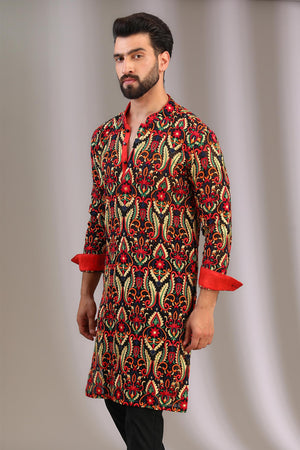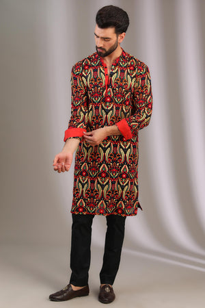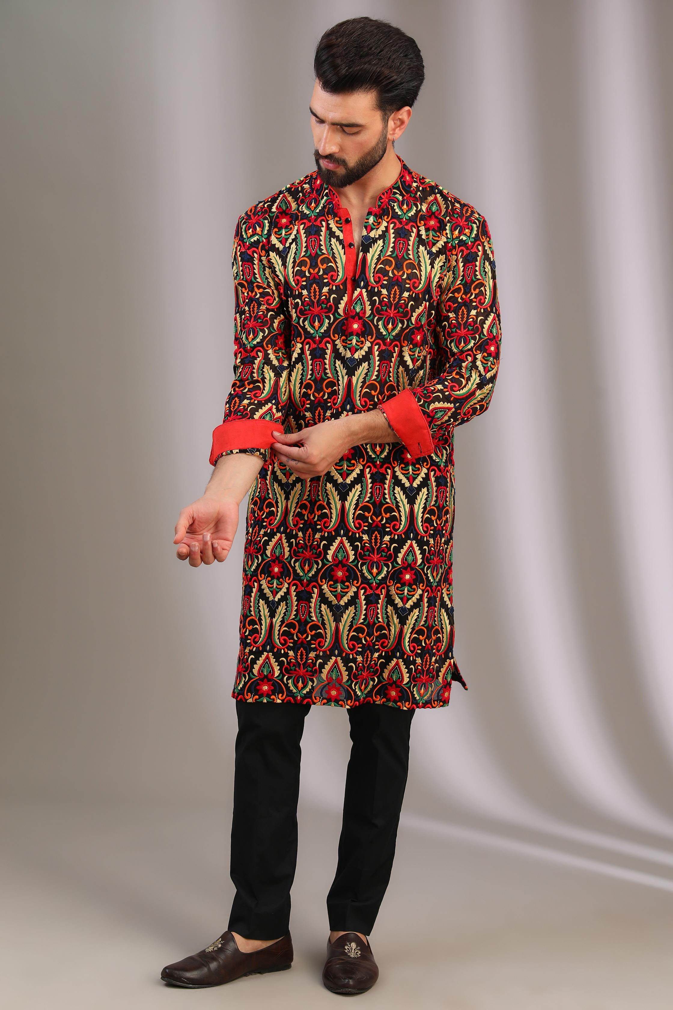 BLACK GORGETTE MULTI COLOR SILK THREAD UNLINED KURTA W COTTON SILK PANT