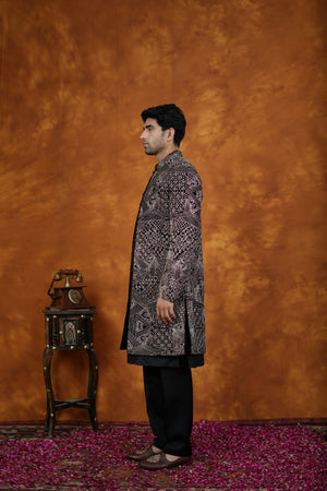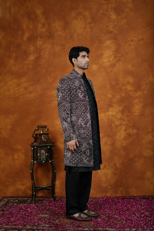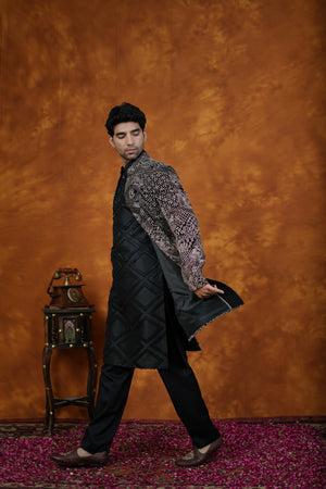 Featuring a black achkan jacket in Japanese suiting base with embroidery. It is paired with black trousers. Perfect wear for a wedding or sangeet ceremony, exuding traditional charm and elegance.