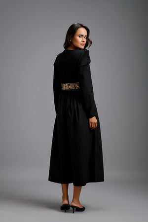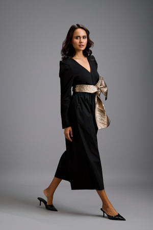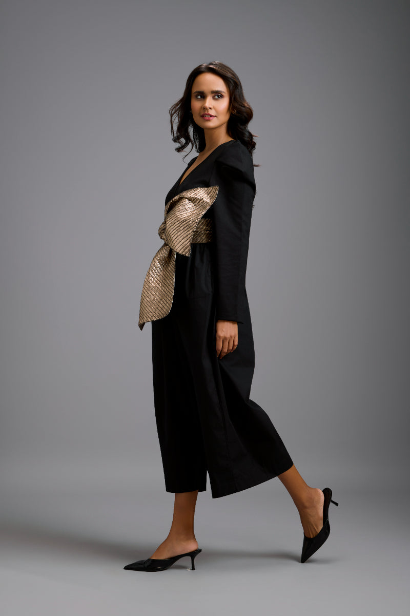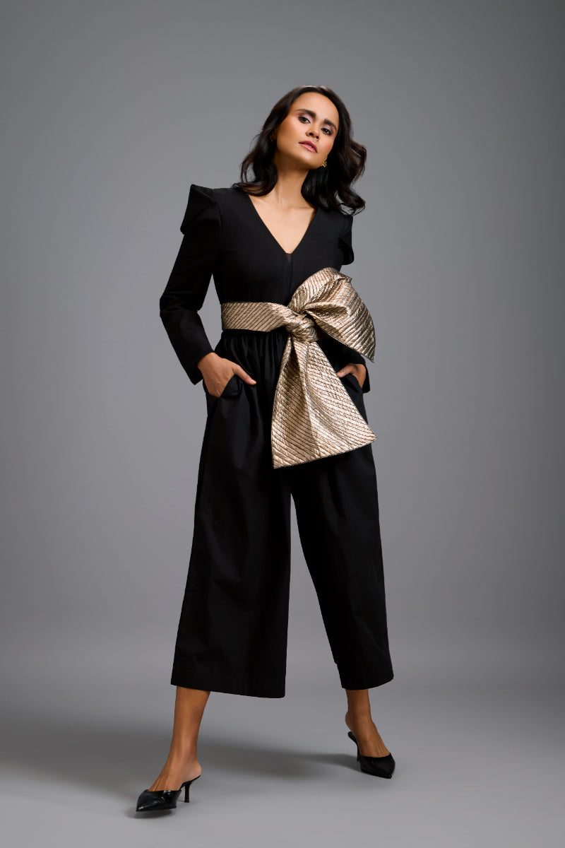 Black Jumpsuit With A V-Neckline And Voluminous Shoulders, Cinched At The Waist By A Large, Textured Gold Bow