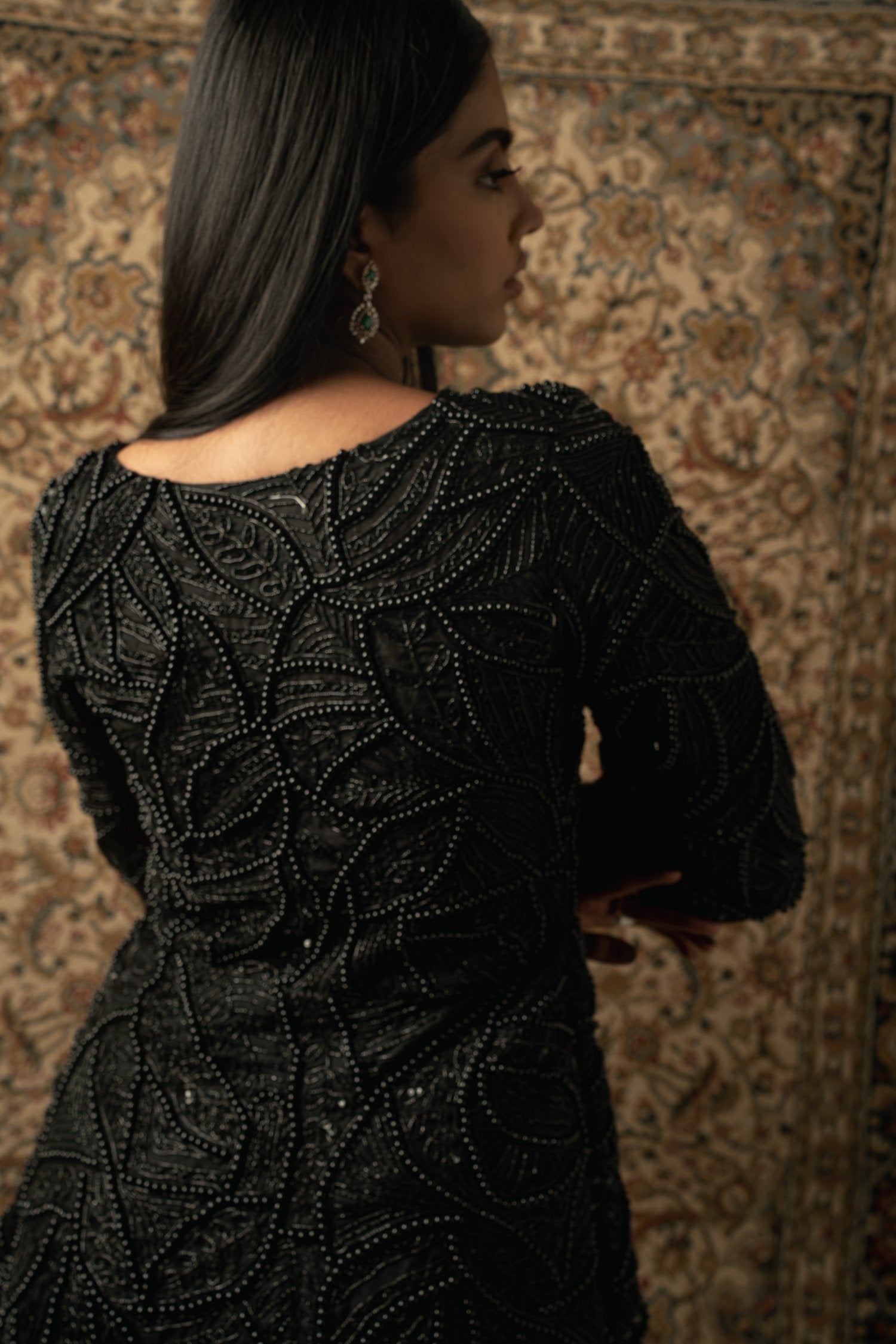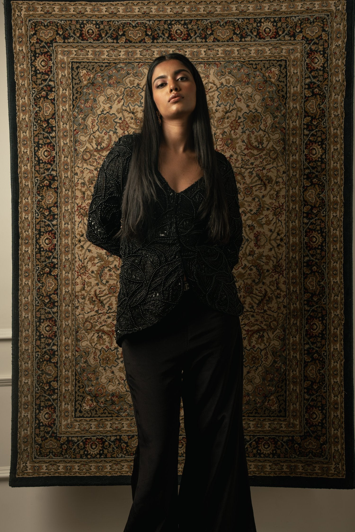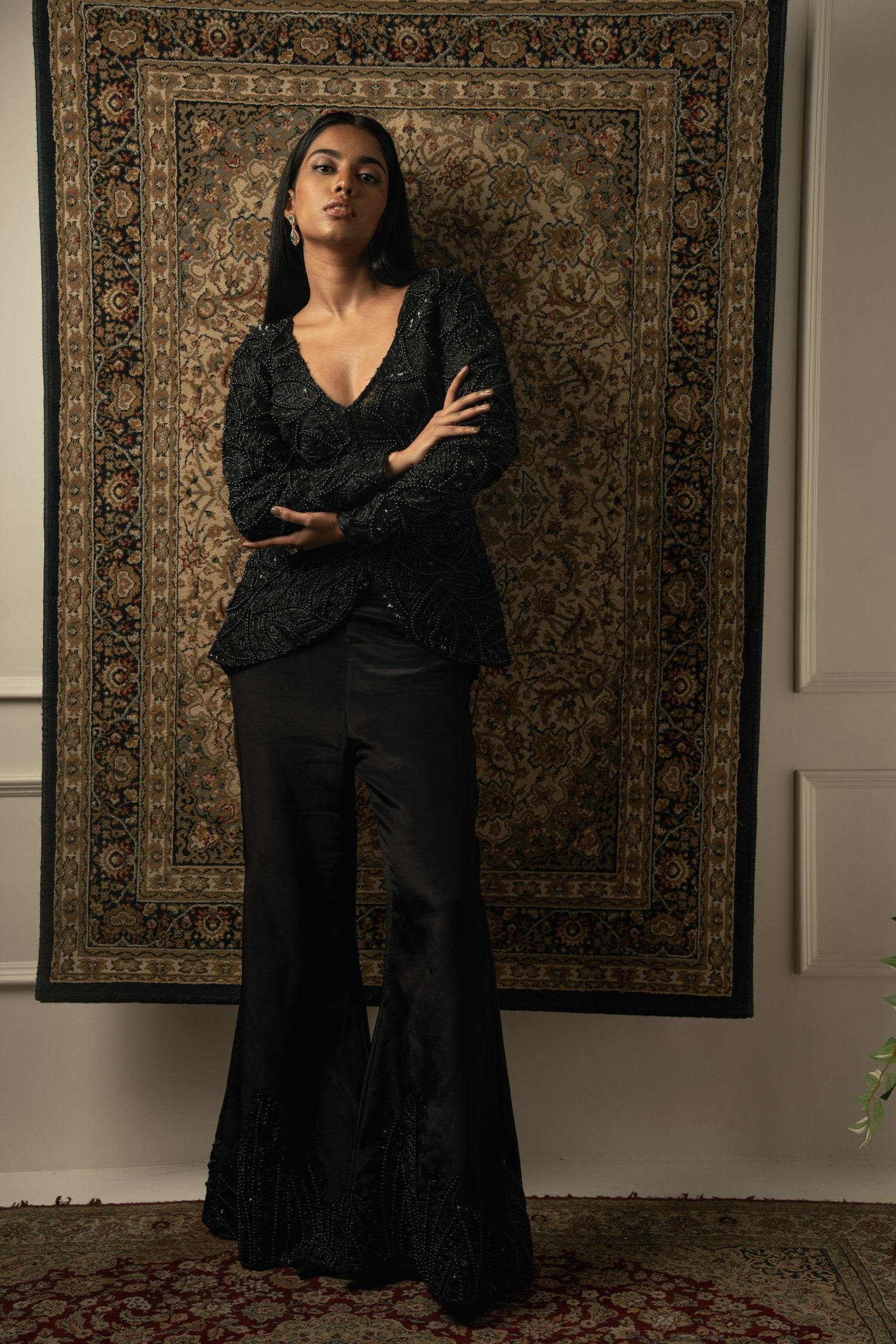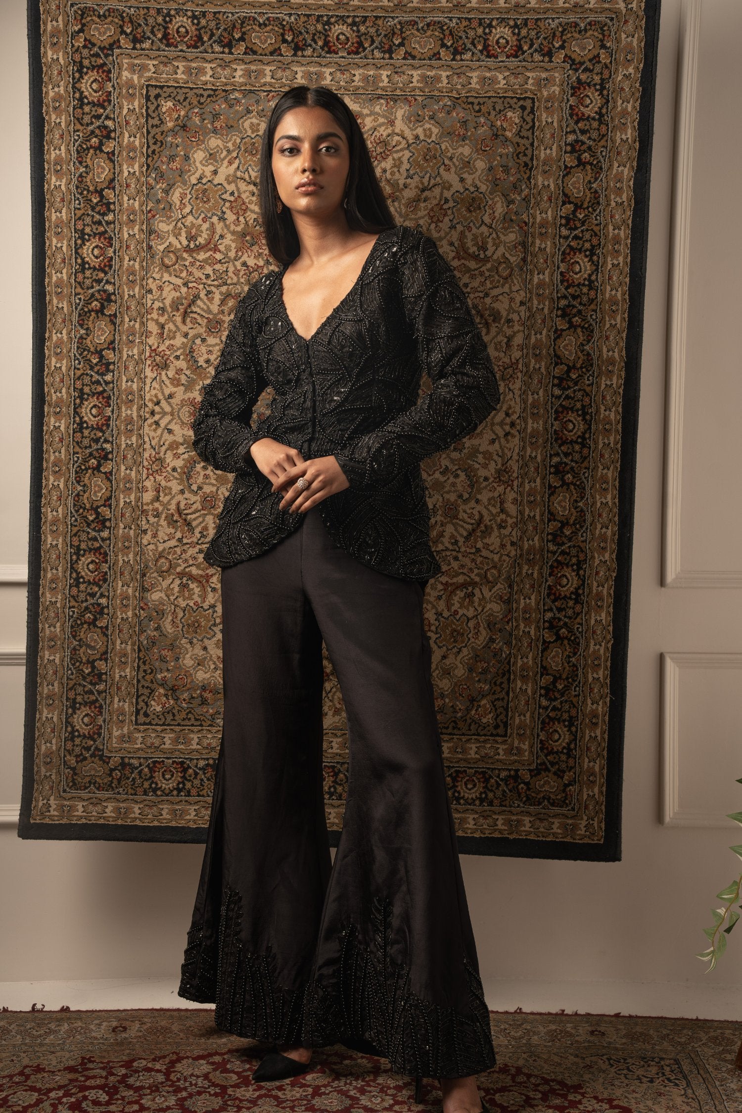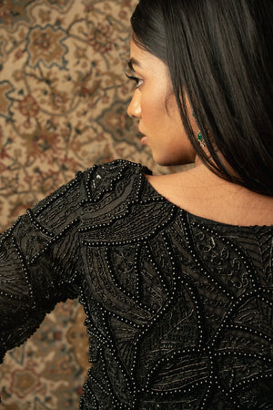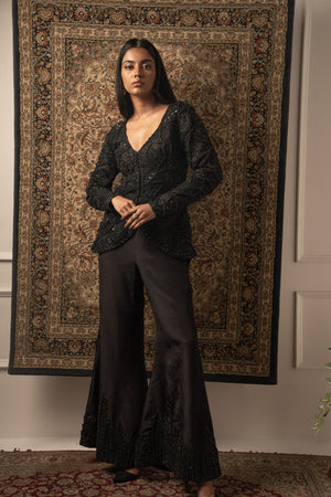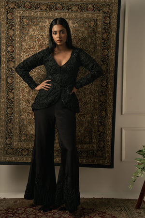 This decadent black pant set embodies unparalleled craftsmanship, showcasing meticulous attention to detail. The top, crafted from luxurious Organza, features intricate bead embroidery that adds an element of sophistication and allure. Paired with silk pants adorned with beautiful embroidery, the ensemble exudes opulence and elegance. Each stitch is a testament to exquisite artistry, making this ensemble a standout choice for any special occasion or formal event.