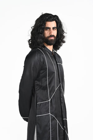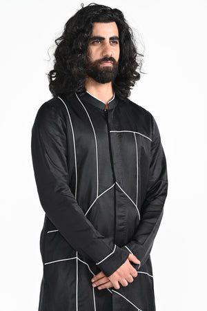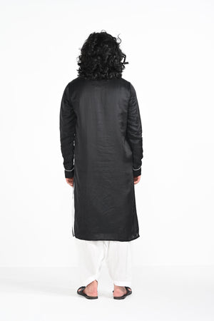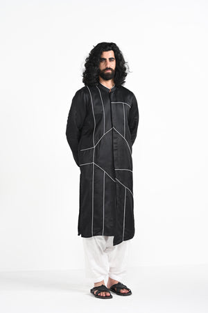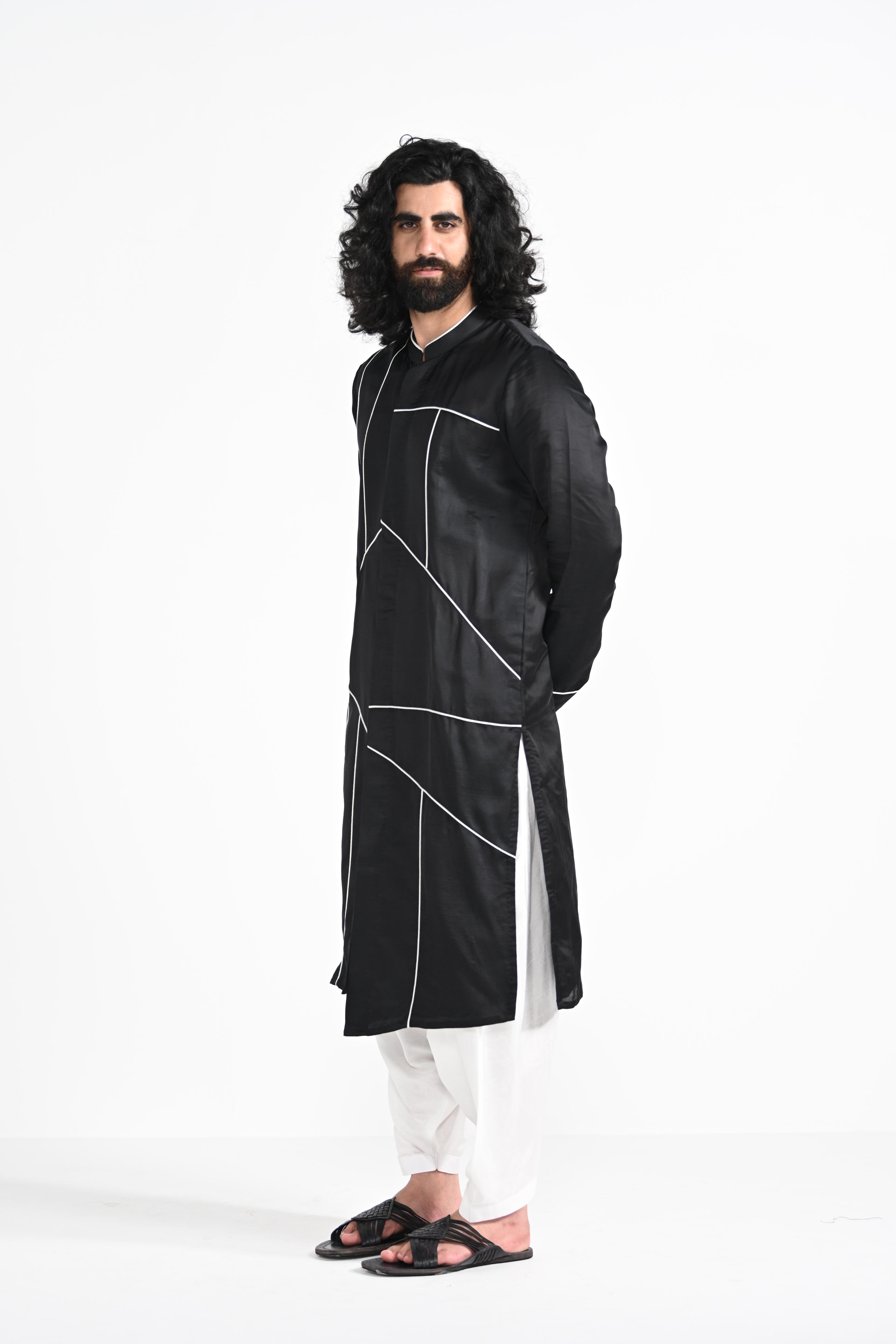 Black cord piping work on linen satin.Paired with White Salwar. Color of the actual garment may vary due to lighting conditions during the shoot .