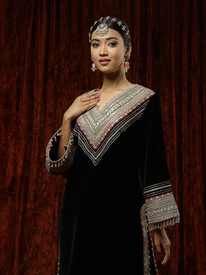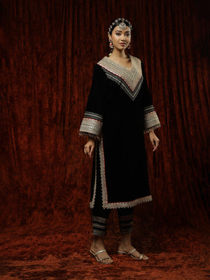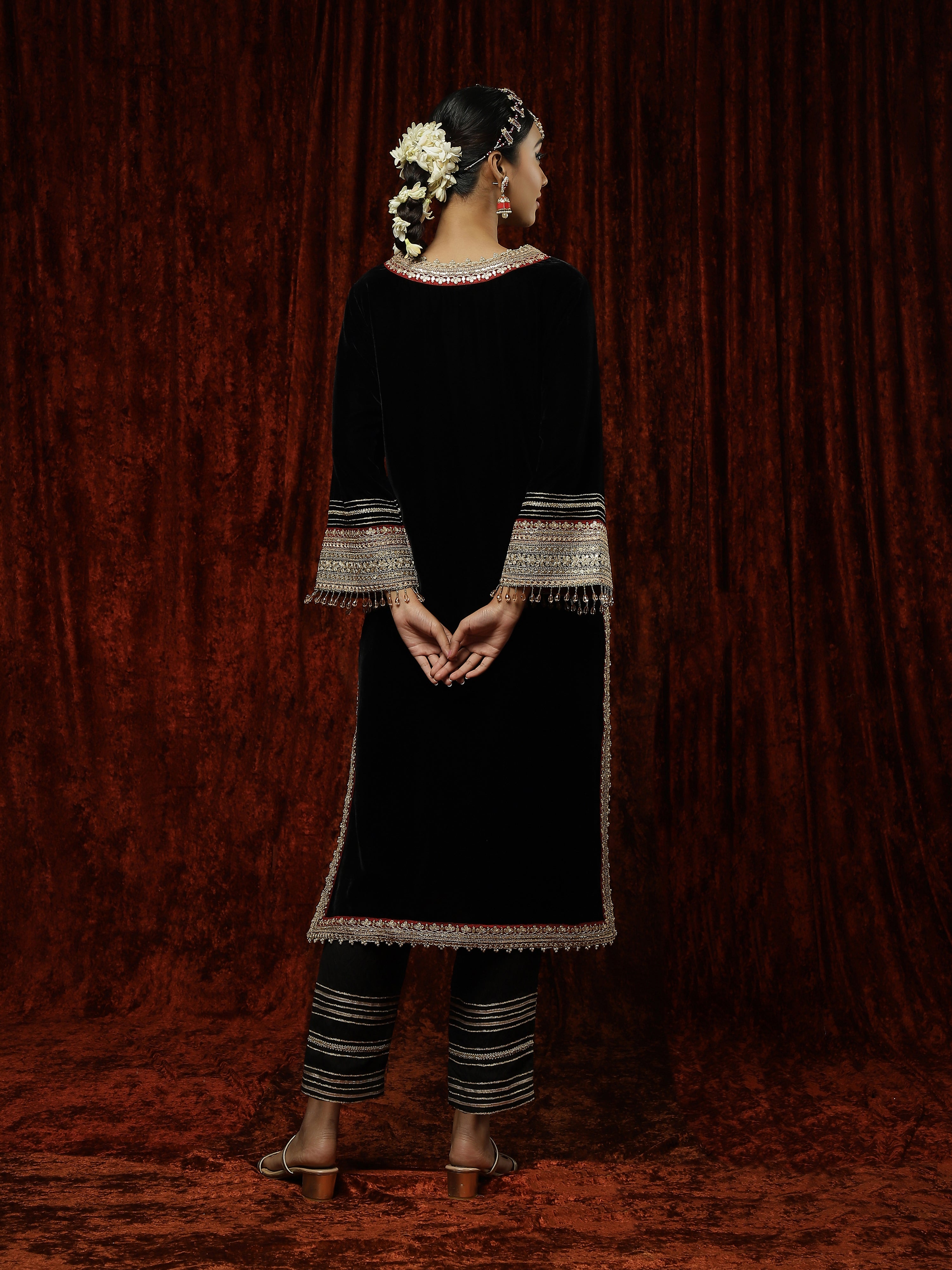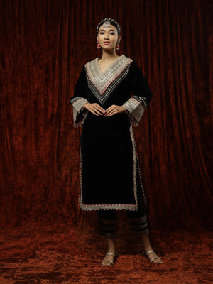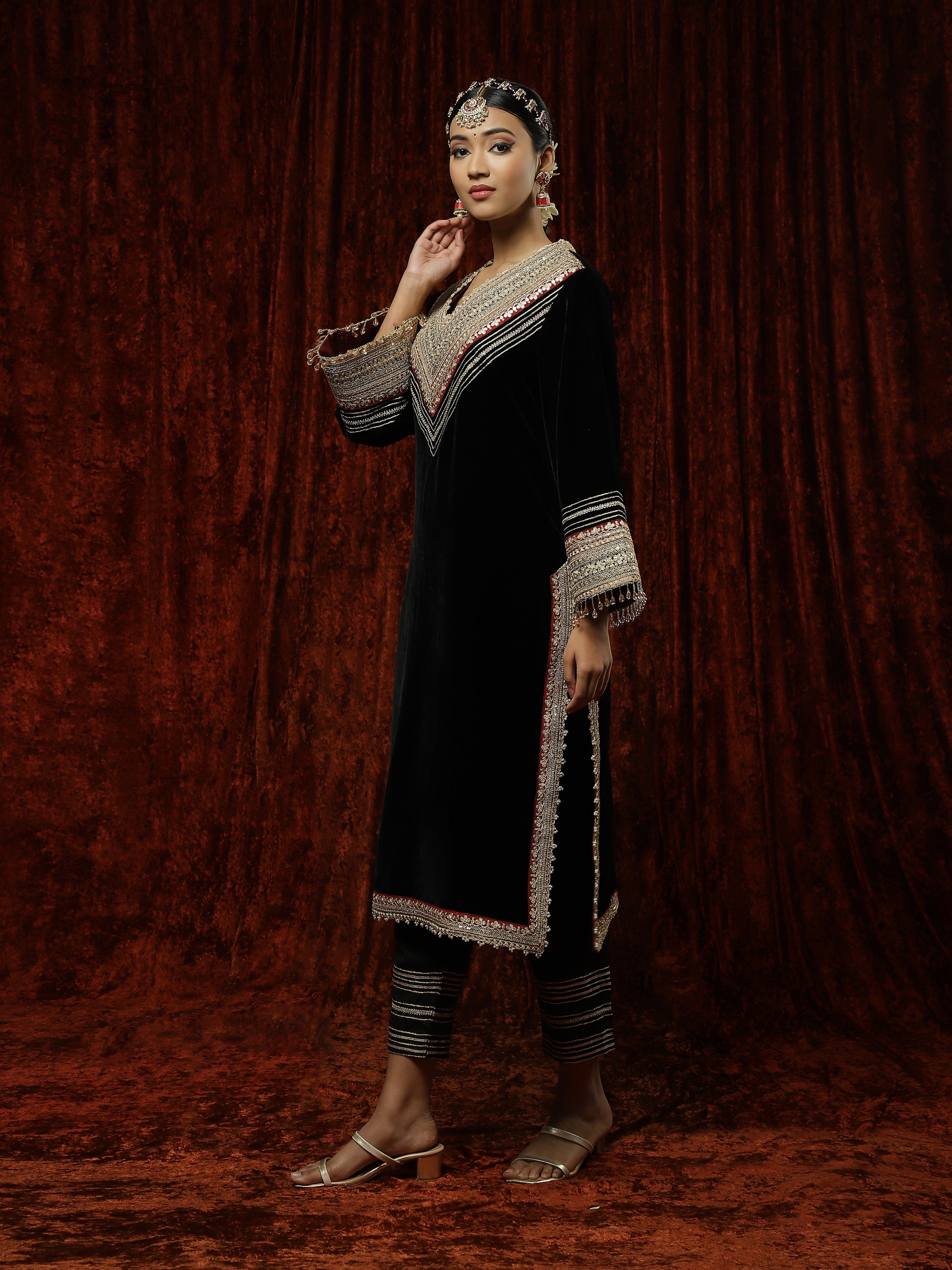 Featuring a Black & Maroon kurta Pant set in Velvet with dori, badla and kasab work. It is paired with a matching silk chanderi pants having gota detailing