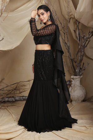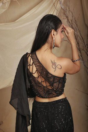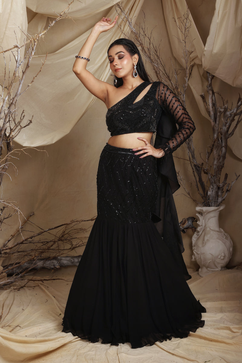 Black tulle one shoulder blouse paired with a mermaid skirt embroidered with cutdana, glass beads, crystals featuring ruffle trail on one shoulder