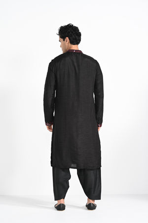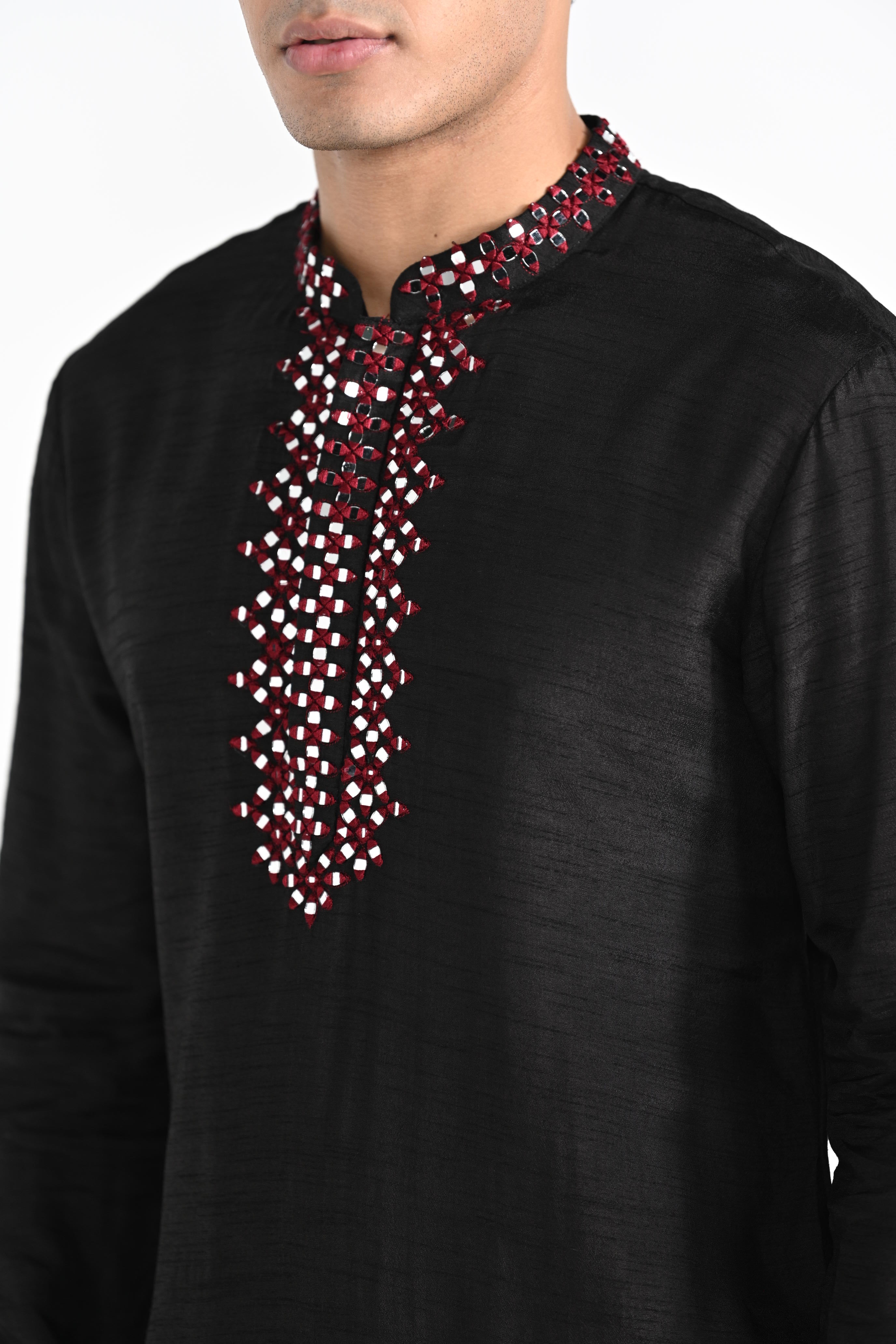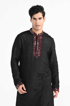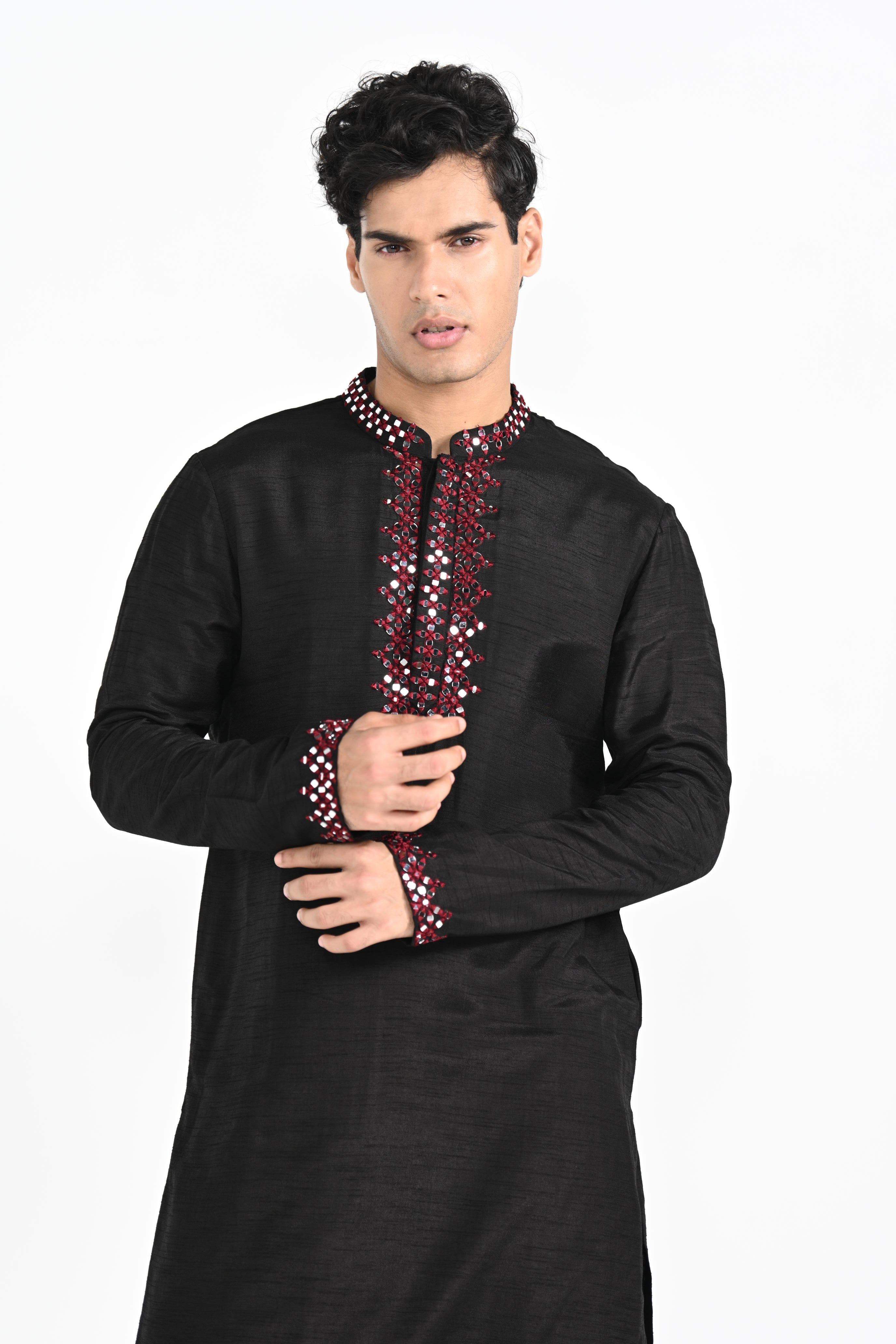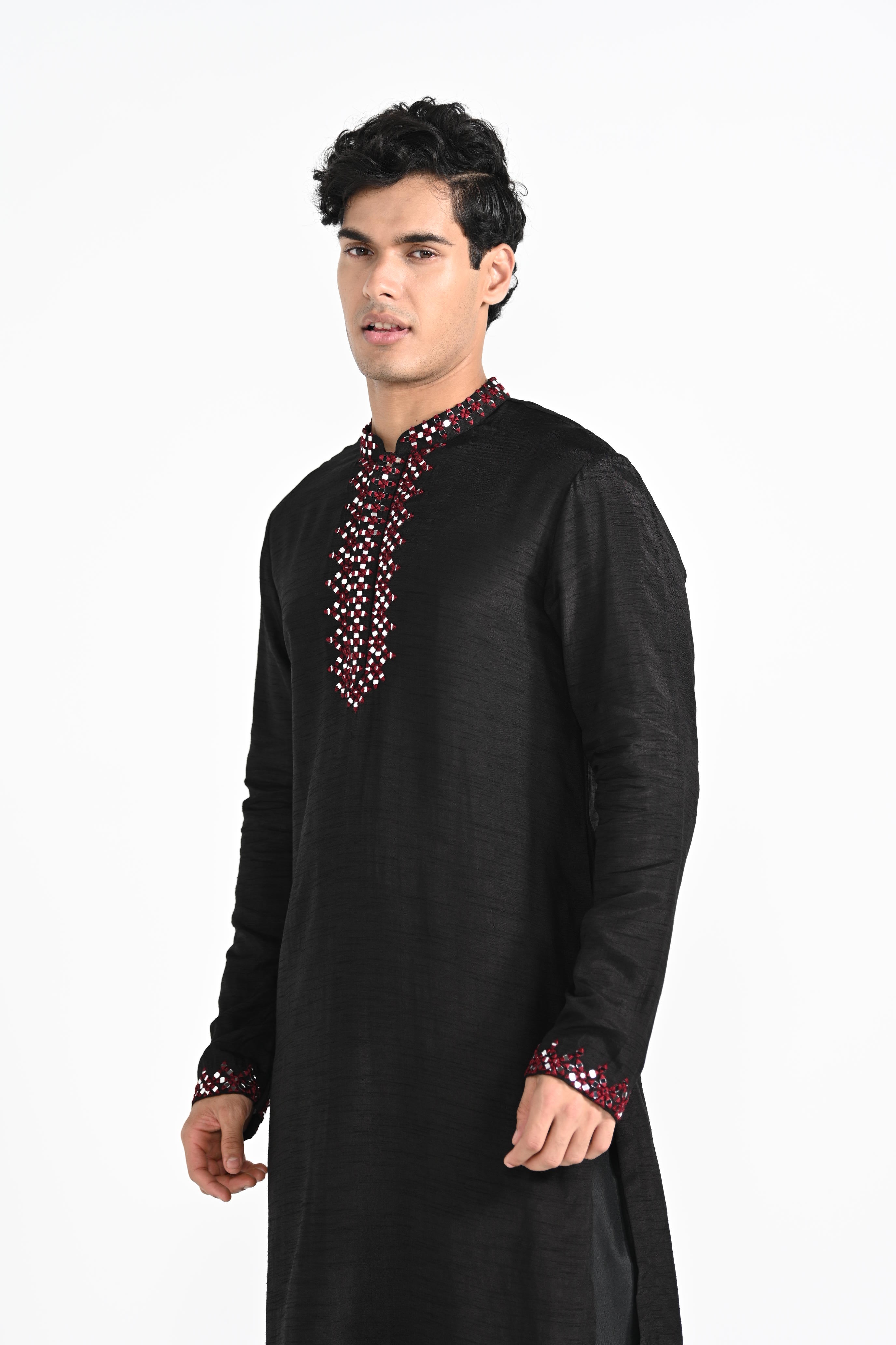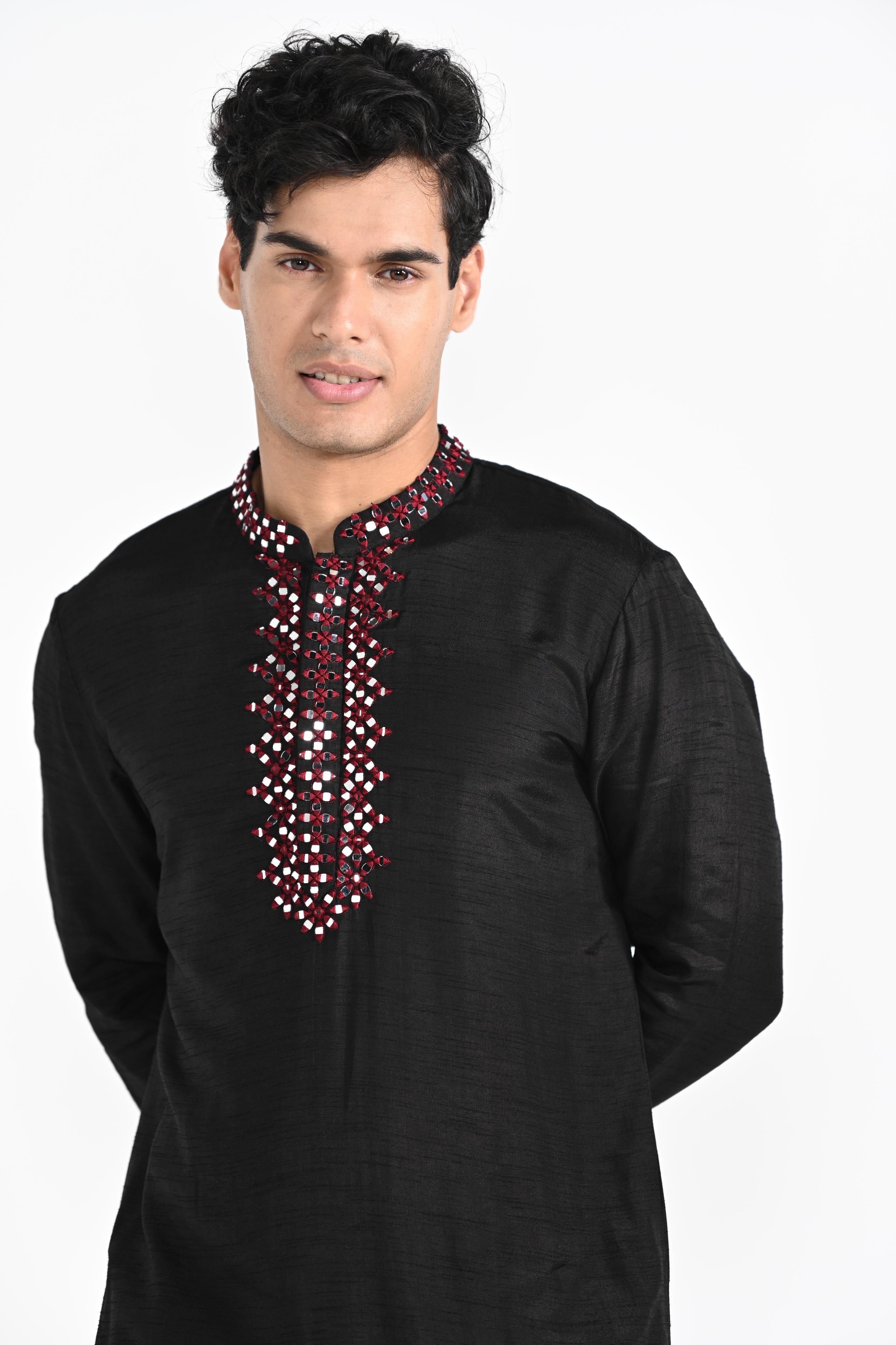Black Arround Neck Mirror work embroidered on bamberg raw silk.Paired with Black Salwar. Color of the actual garment may vary due to lighting conditions during the shoot .