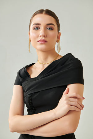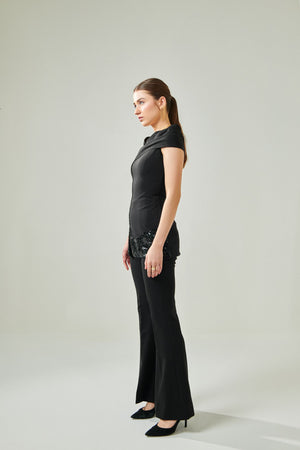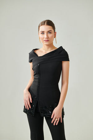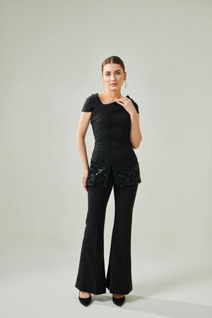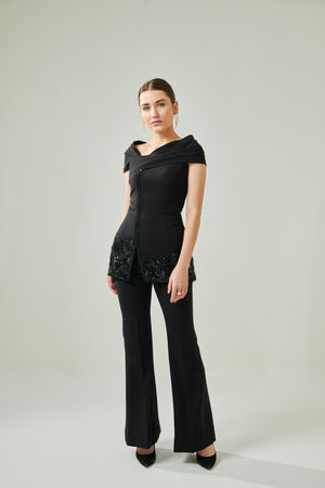 Draped One Shoulder Co-Ord Set With Hand Embroidered Top Detailing.Top Is Embellished With Sequence, Beads And Katdana, Pants Are Bell Bottoms, Standard Top Length-30 Inches; Pants Length- 42 Inches