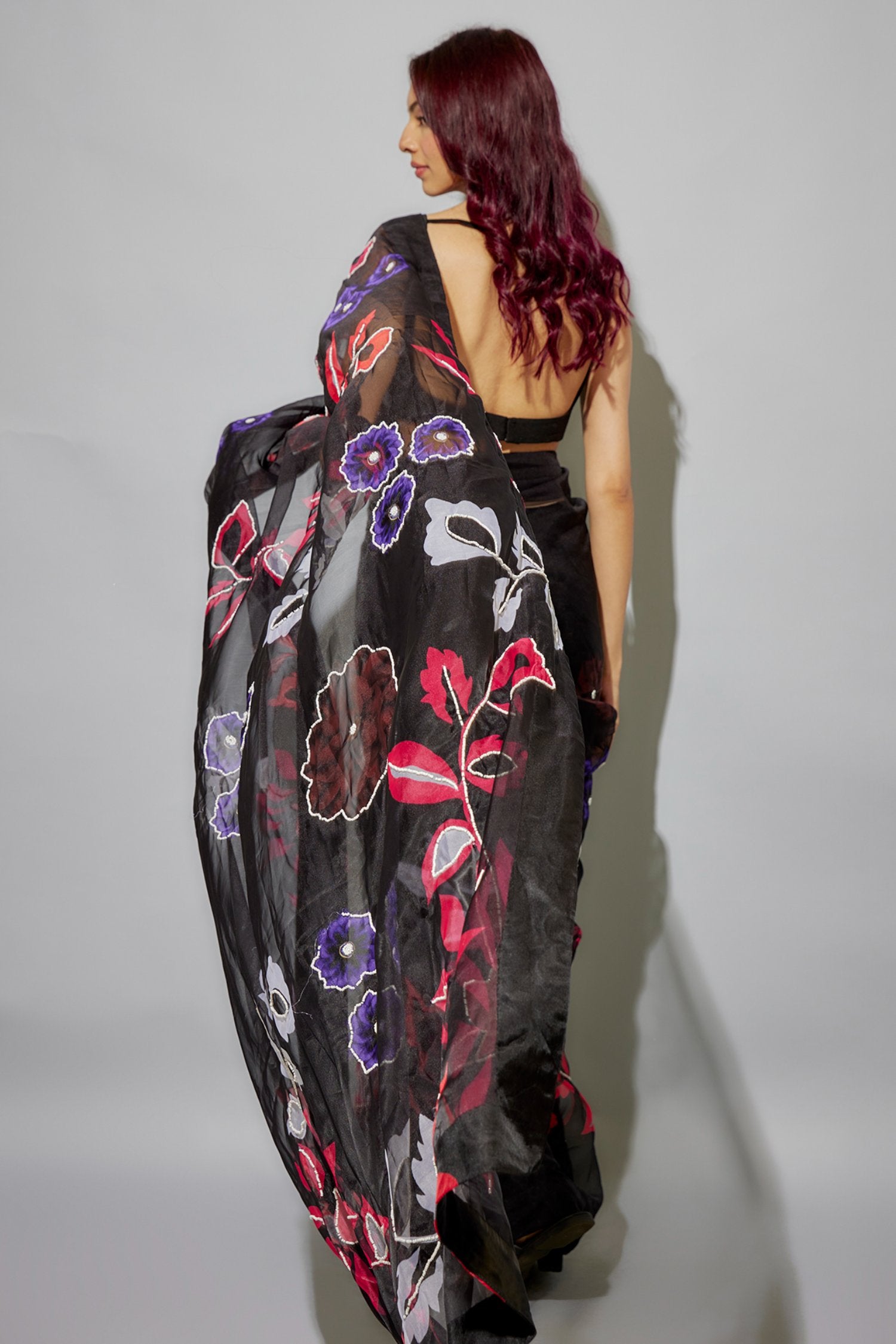 Black organza base floral printed pre-draped saree with glass beads embroidery detailing paired with matching raw silk based blouse