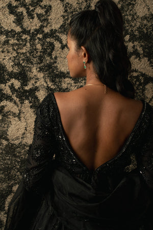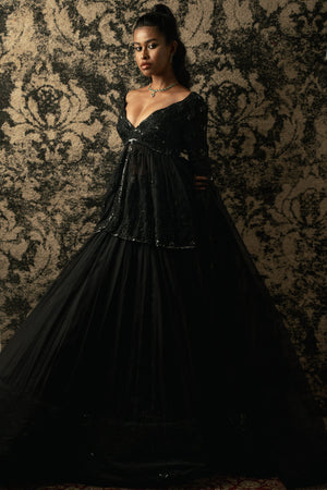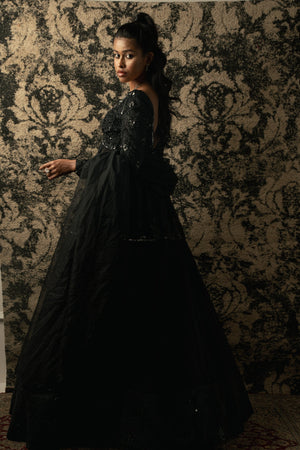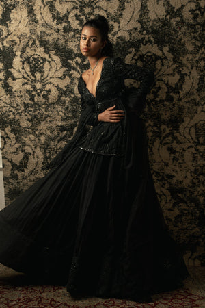 This black Kurta Set epitomizes graceful elegance with its exquisite design and attention to detail. The kurta, crafted in classic black, is adorned with intricate thread and kad dana tonal embroidery, adding a touch of sophistication and charm. Paired with a flowing organza skirt, the ensemble exudes ethereal beauty, while the organza peplum adds a modern twist with its delicate draping and embroidery. Together, these elements create a harmonious ensemble that seamlessly blends tradition with contemporary style, perfect for making a statement at any special occasion.