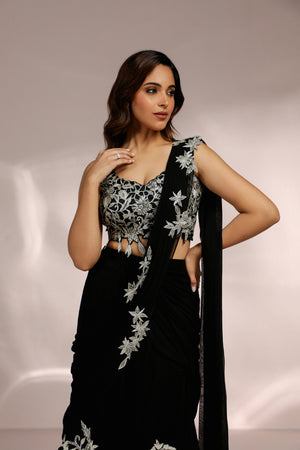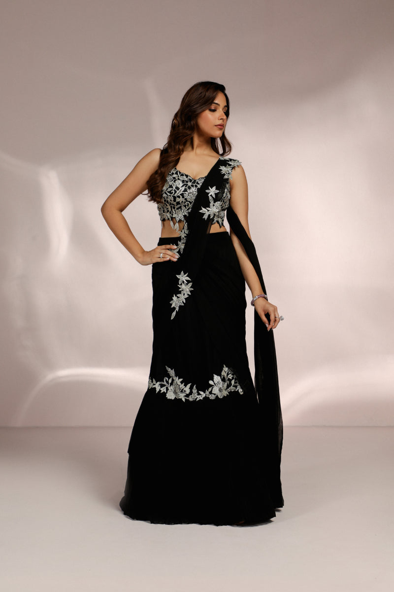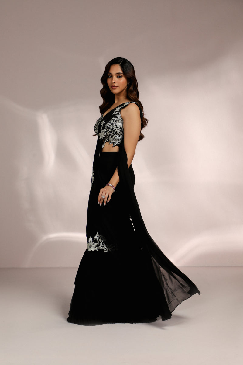 Black cutwork embroidered blouse with no lining at the back .Paired with two layer pleated fish cut draped skirt .