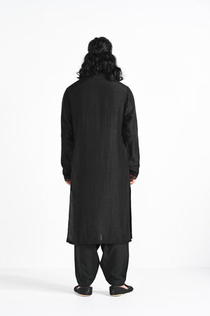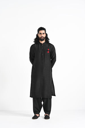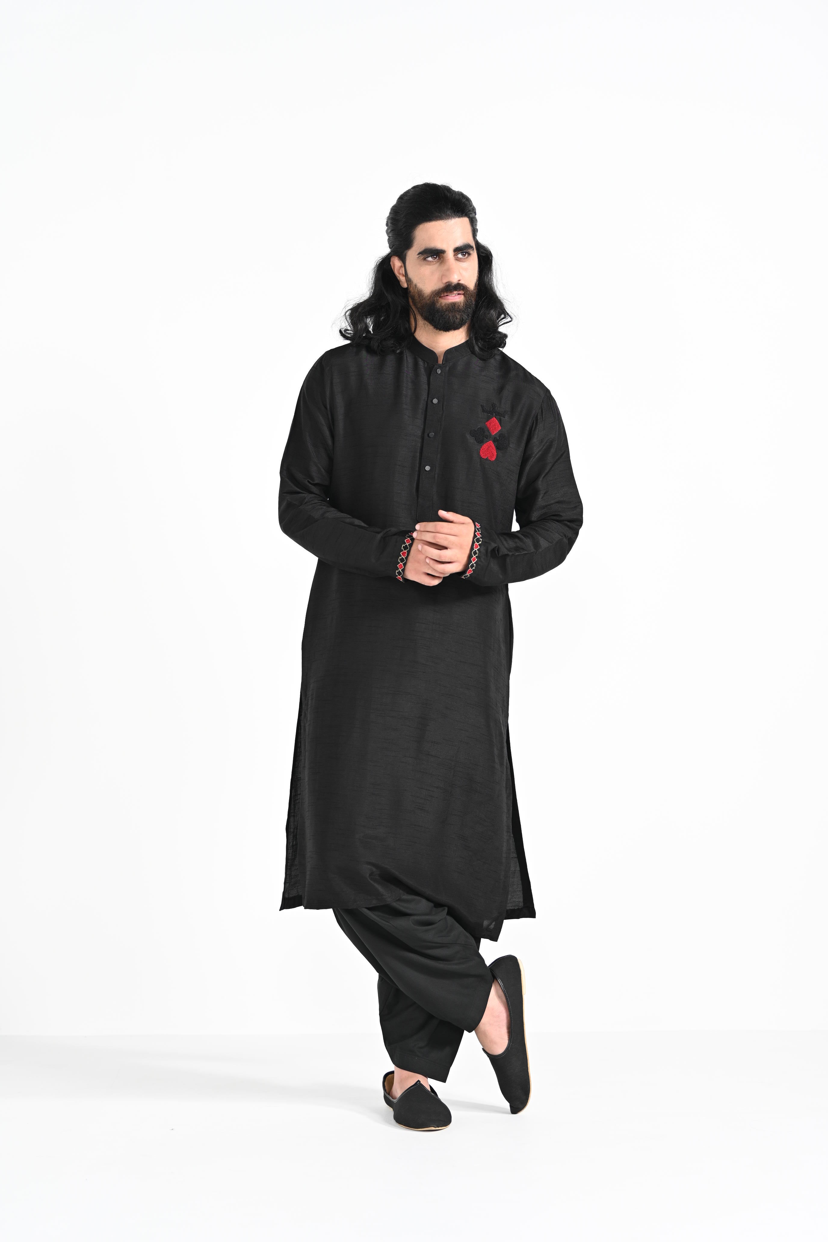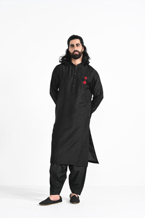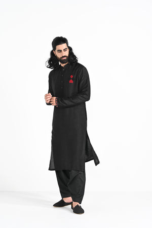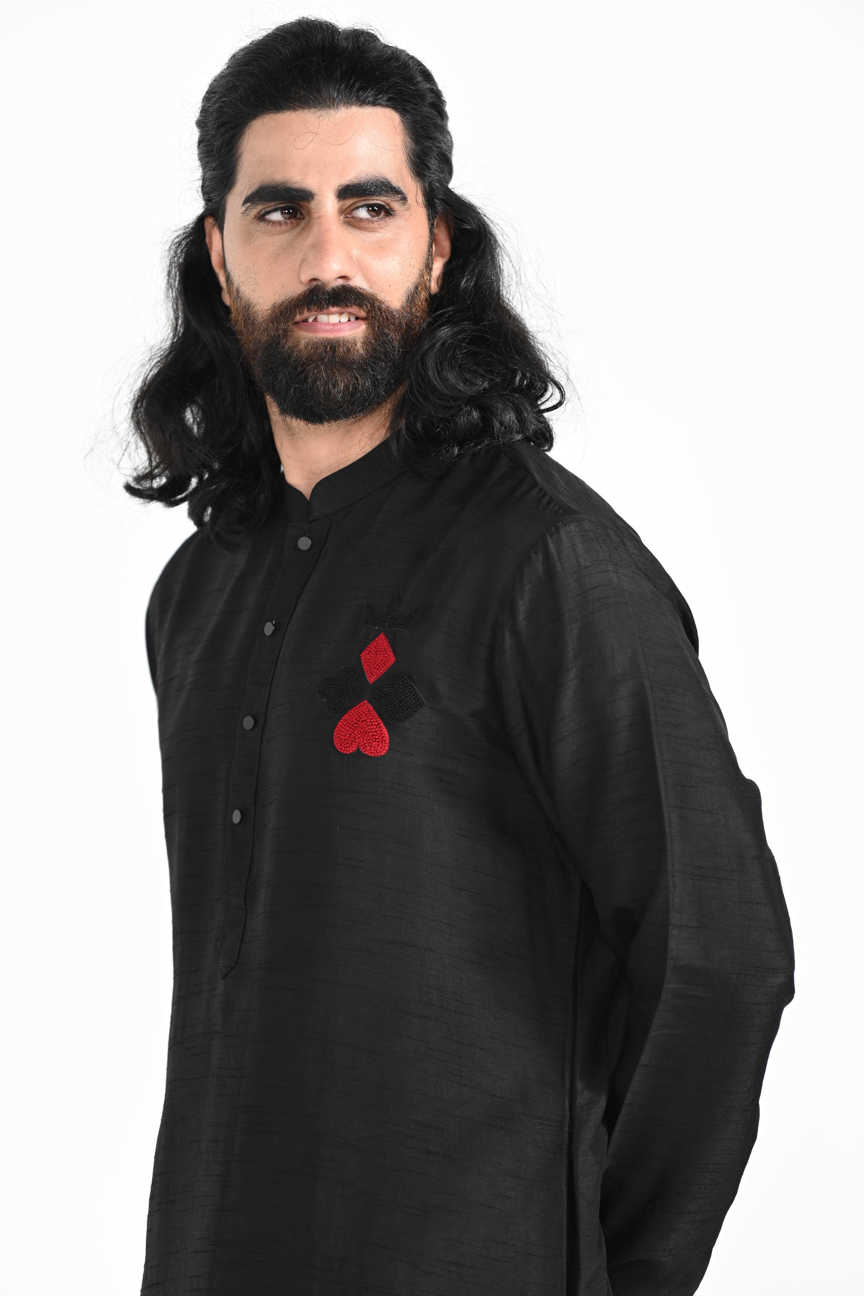 Black Poker 3 thread work embroidered on bamberg raw silk.Paired with Black Salwar. Color of the actual garment may vary due to lighting conditions during the shoot .