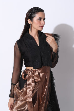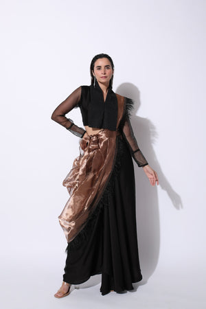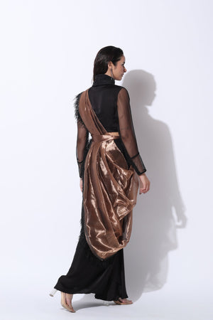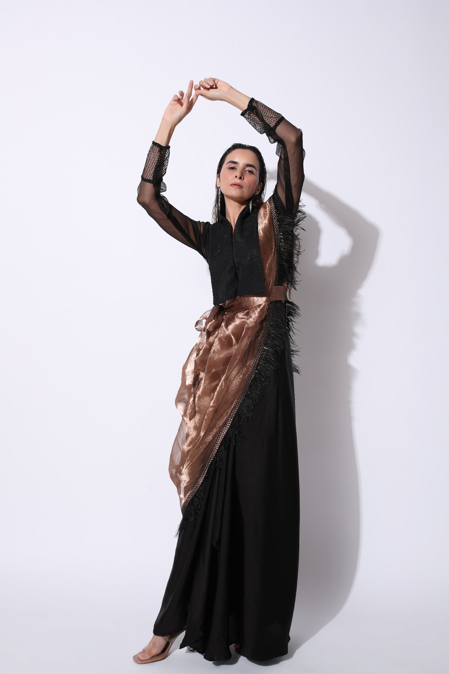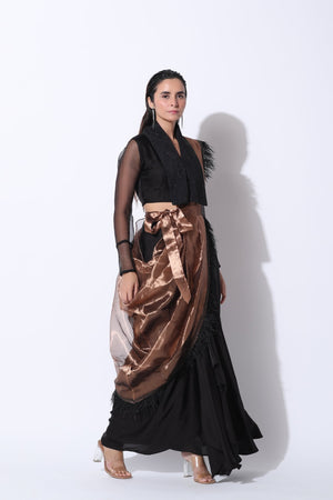 This set comprises of a black blouse with rhinestone detailing in collar and sleeves, a pre draped skirt and a separate cowl drape in copper with feather trims. An additional tie up belt in tissue is also provided for further styling.