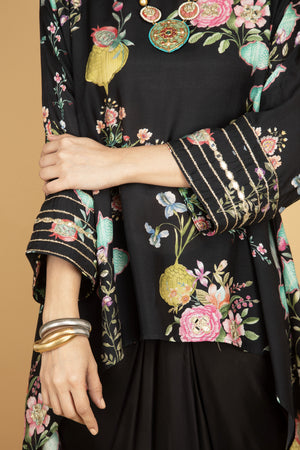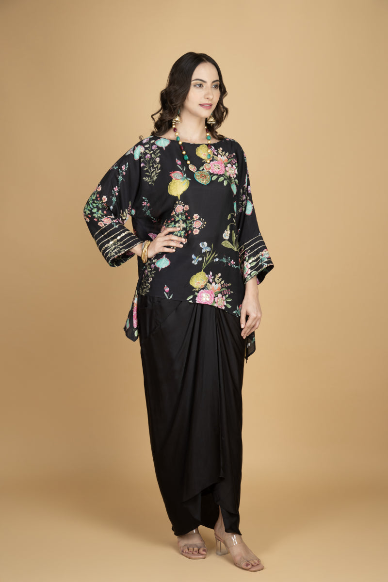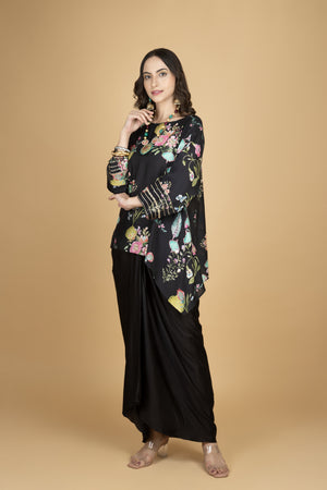 Black Printed Embroidered High Low Top W/Drape Skirt