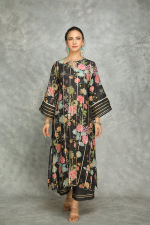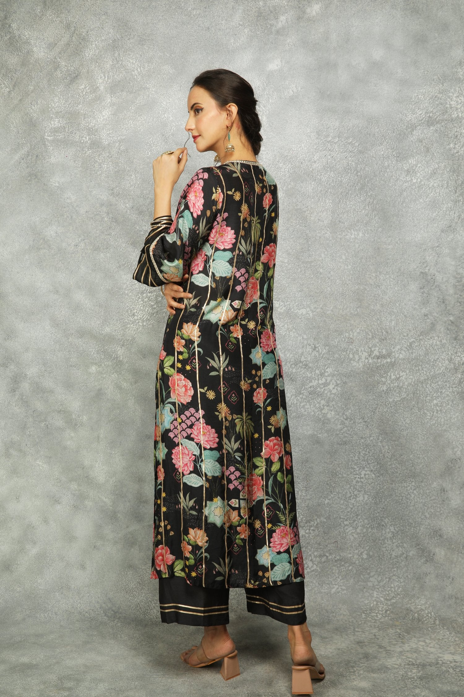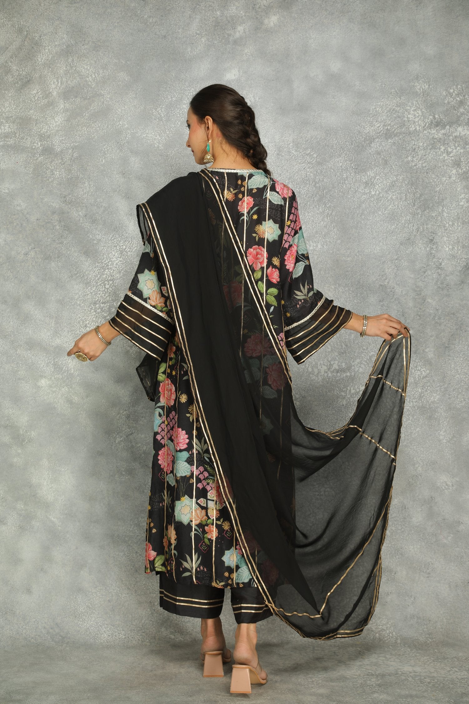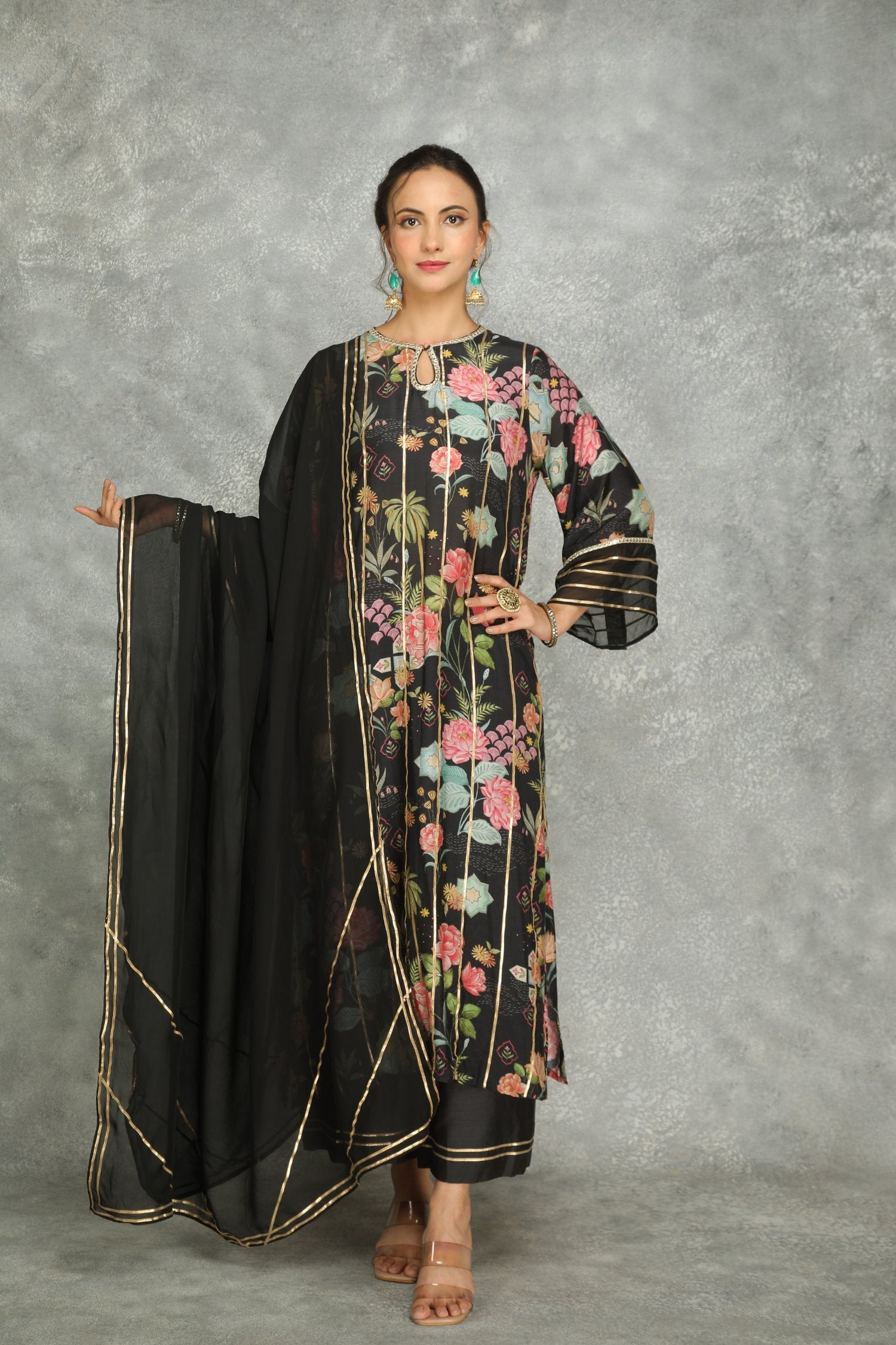 This beautiful floral digital printed kurta showcases detailed work along the neckline, enhanced by intricate gota work that adds a traditional charm. Paired with solid pants for a balanced yet elegant look, the set is completed with a soft organza dupatta. Ideal for festive occasions or daywear, this ensemble effortlessly blends comfort and style.