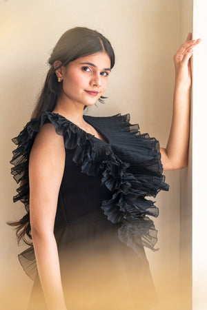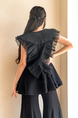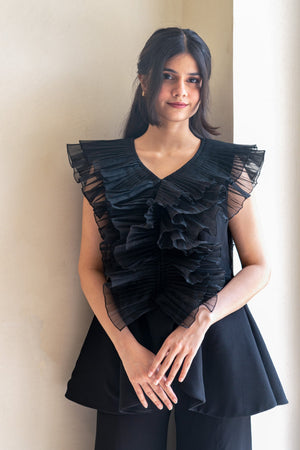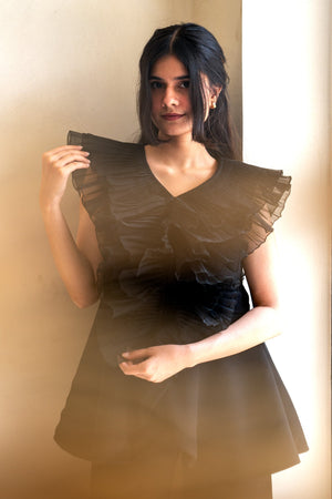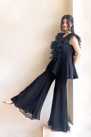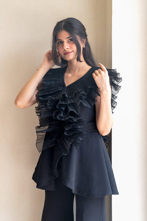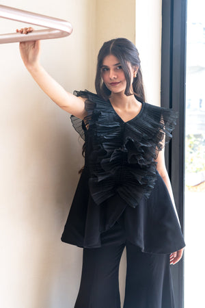 The Baby pink georgette peplum top has three layers of organza pleated ruffles attached to the neck, spreading on the shoulders and body. Paired with the kali bell bottom pants.