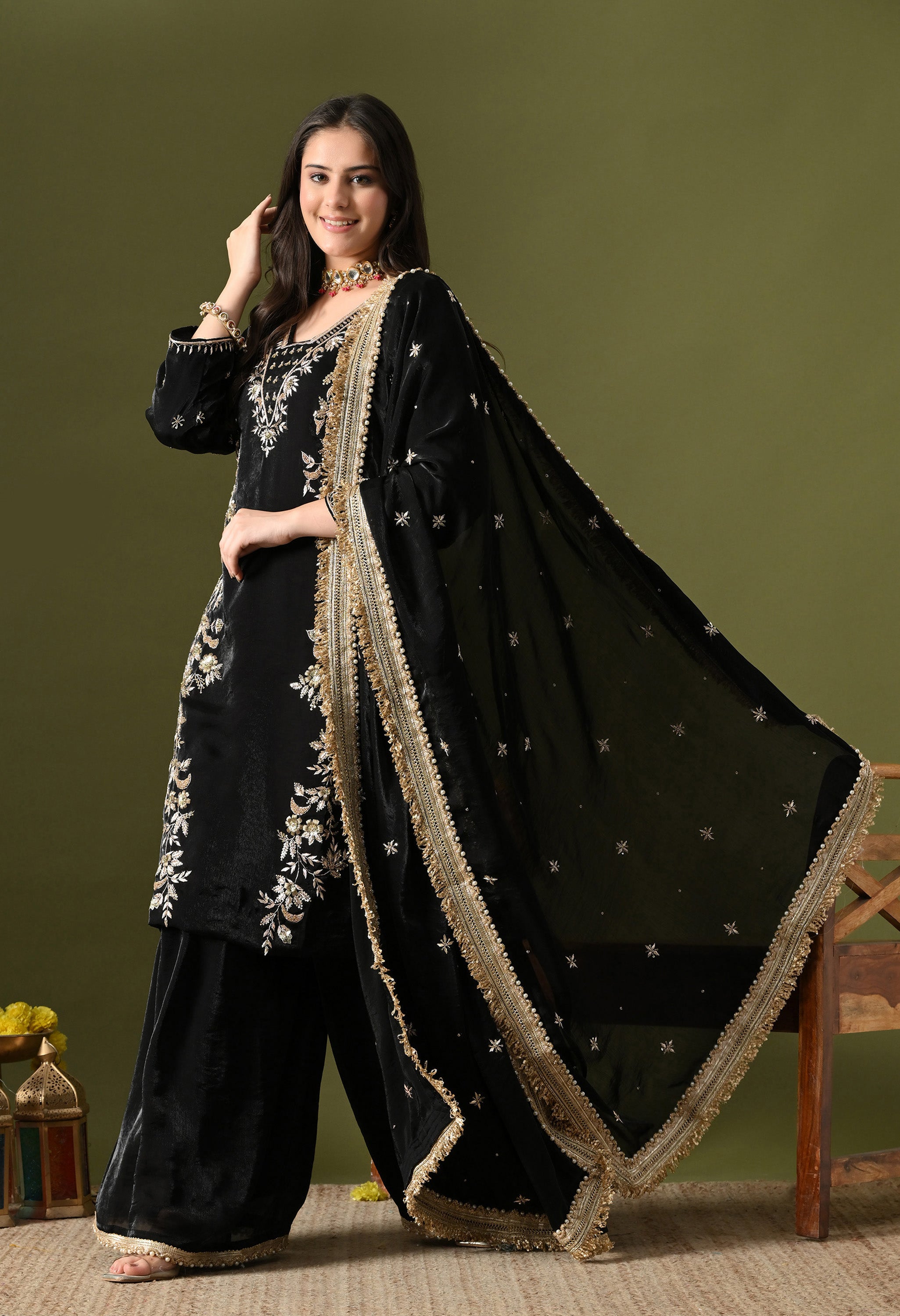 This black sharara set is a timeless festive classic crafted in premium glass silk for a rich, elegant fall. The kurta, dupatta, and sharara feature exquisite hand-crafted, hand-embroidered, and hand embroided zardozi detailing, paired with shimmering sequins that elevate the outfit? luxurious appeal. The deep black tone adds sophistication and grandeur, making it an ideal choice for festive evenings, weddings, and celebratory events.