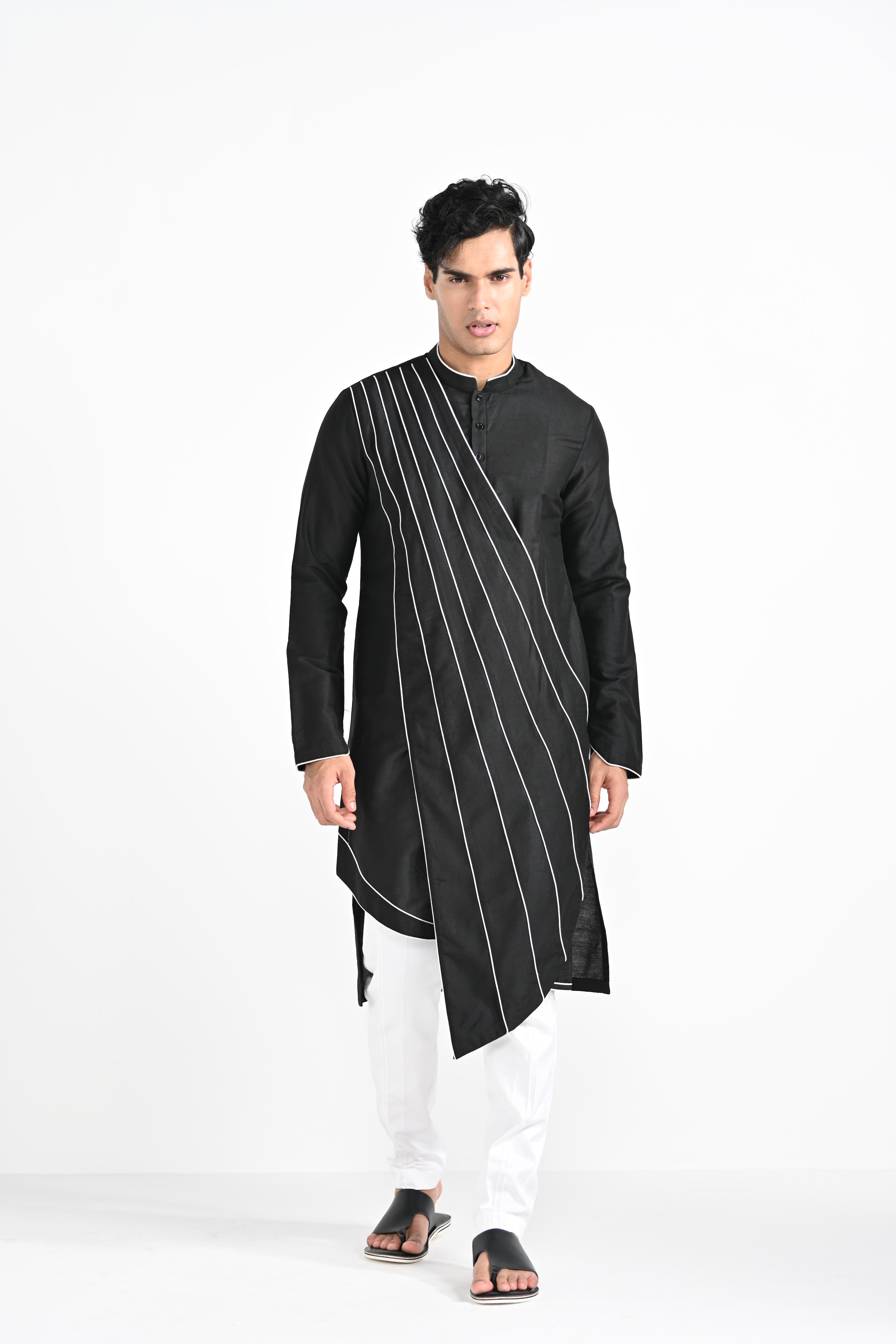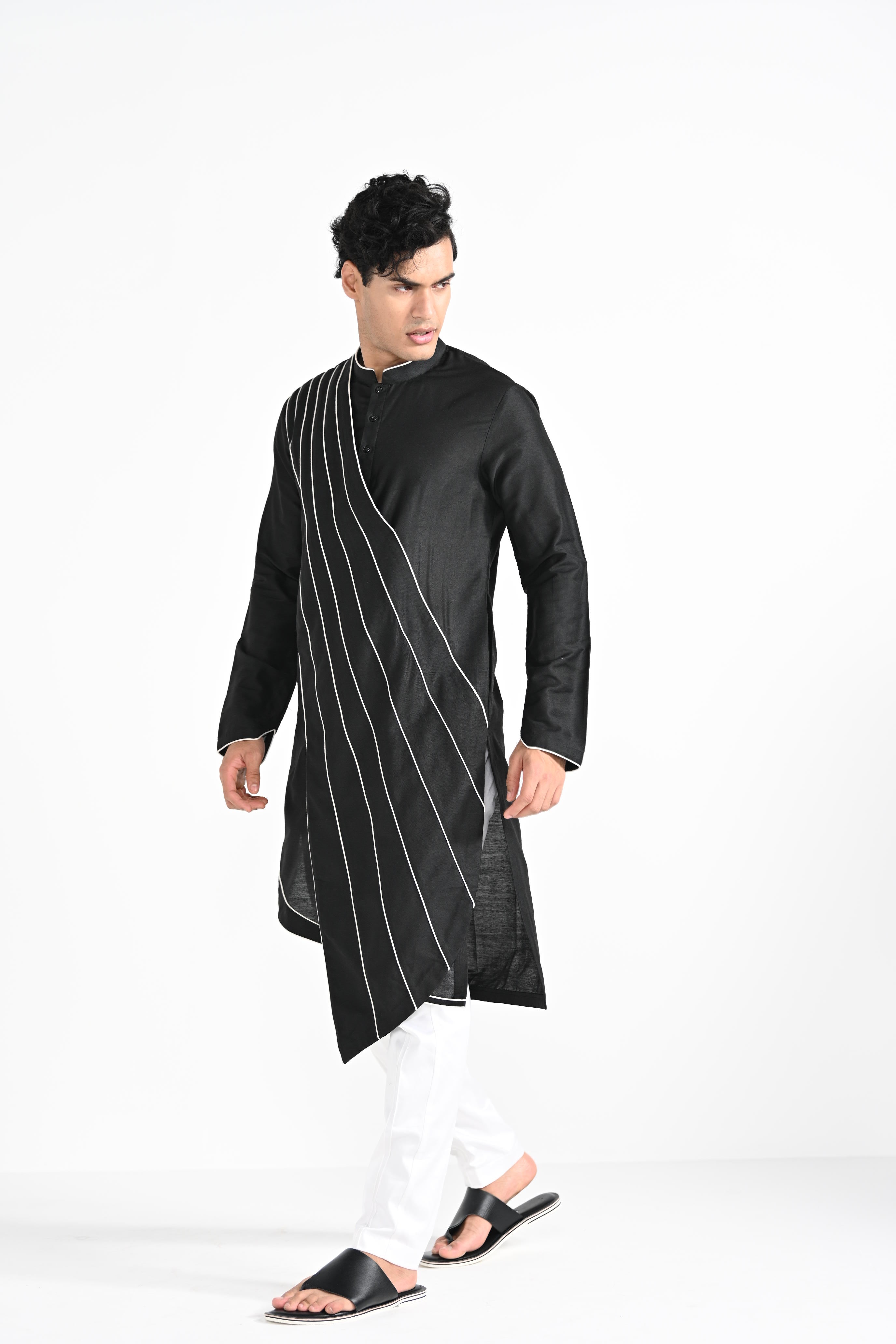 Black Sufi cordpiping work on linen satin.Paired with Buttercream slim fit Pant Pajama. Color of the actual garment may vary due to lighting conditions during the shoot .
