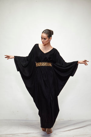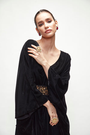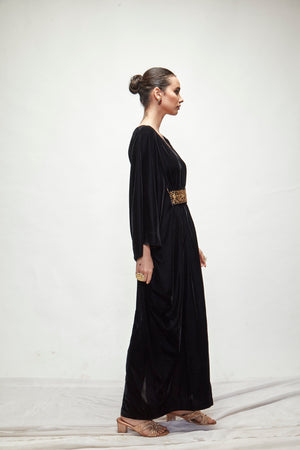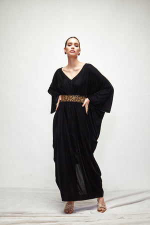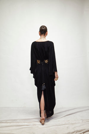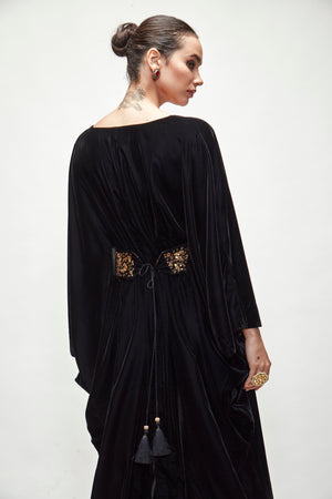 Velvet Kaftaan With Extended Cowl On The Sides For A Relaxed Fit. Back Slit For Ease In Walking. Zardosi Embroidered Belt Complete The Emsemble.