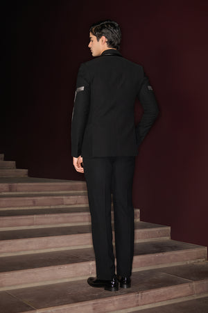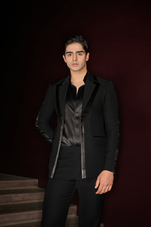A striking all-black tuxedo featuring innovative tailoring with a double collar and sleek leatherite panel, paired with pants and shirt