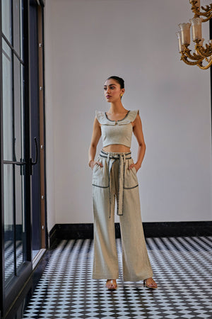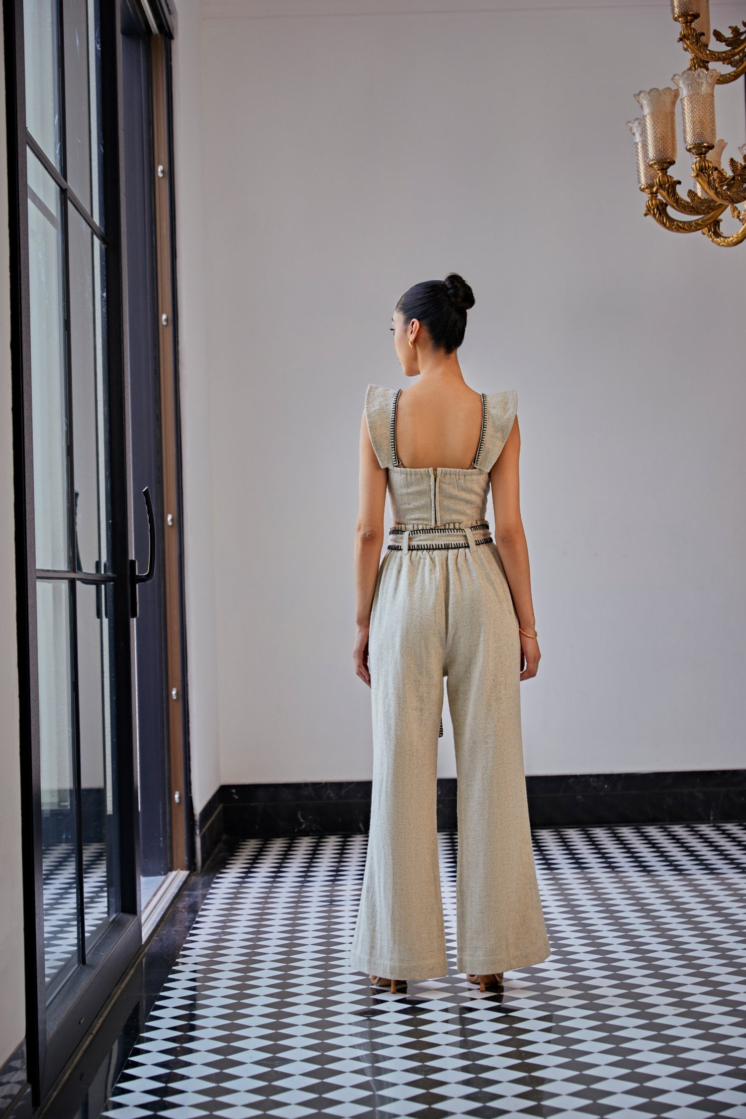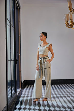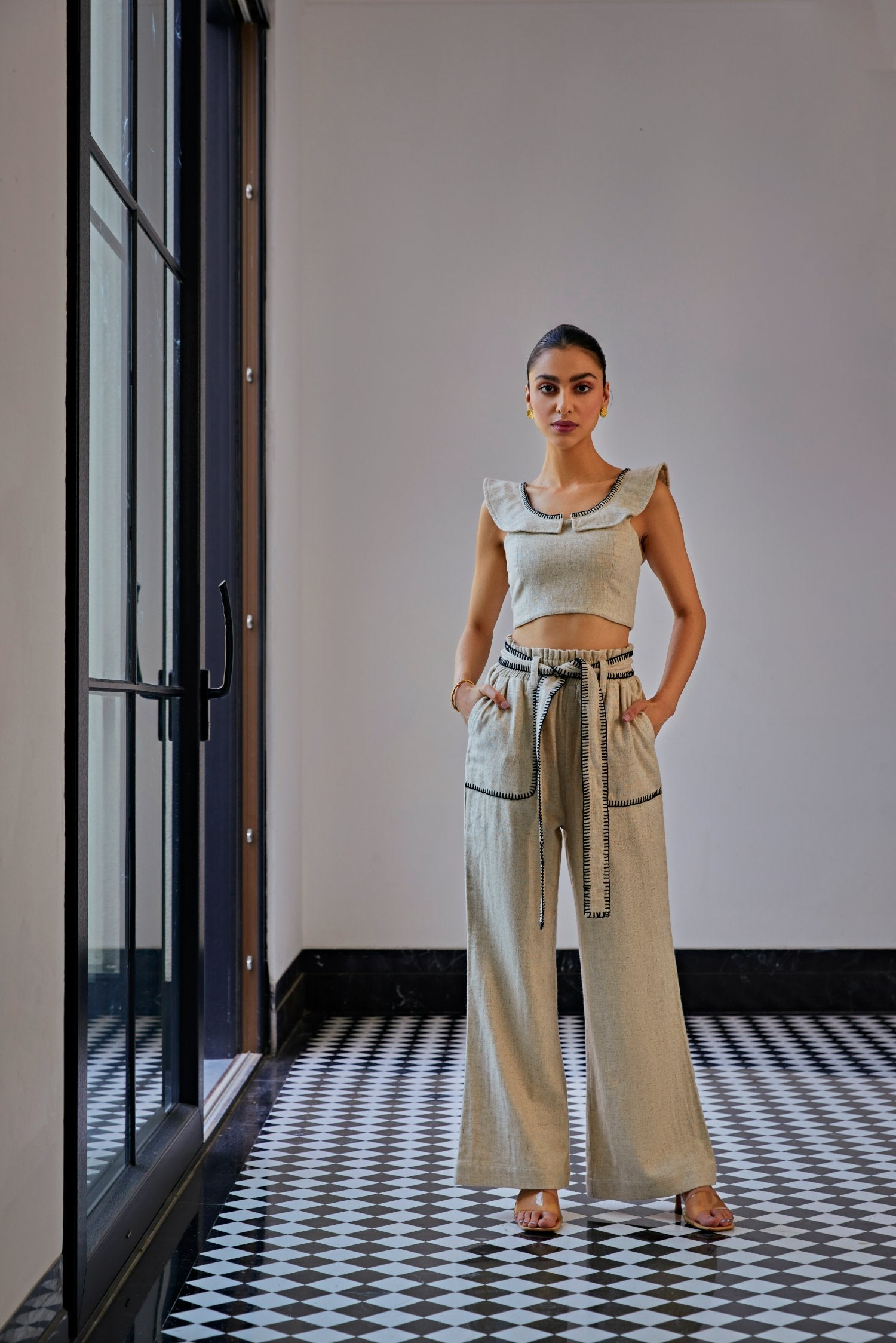Oatmeal co-ord set featuring a top and pants adorned with blanket stitch hand embroidery.