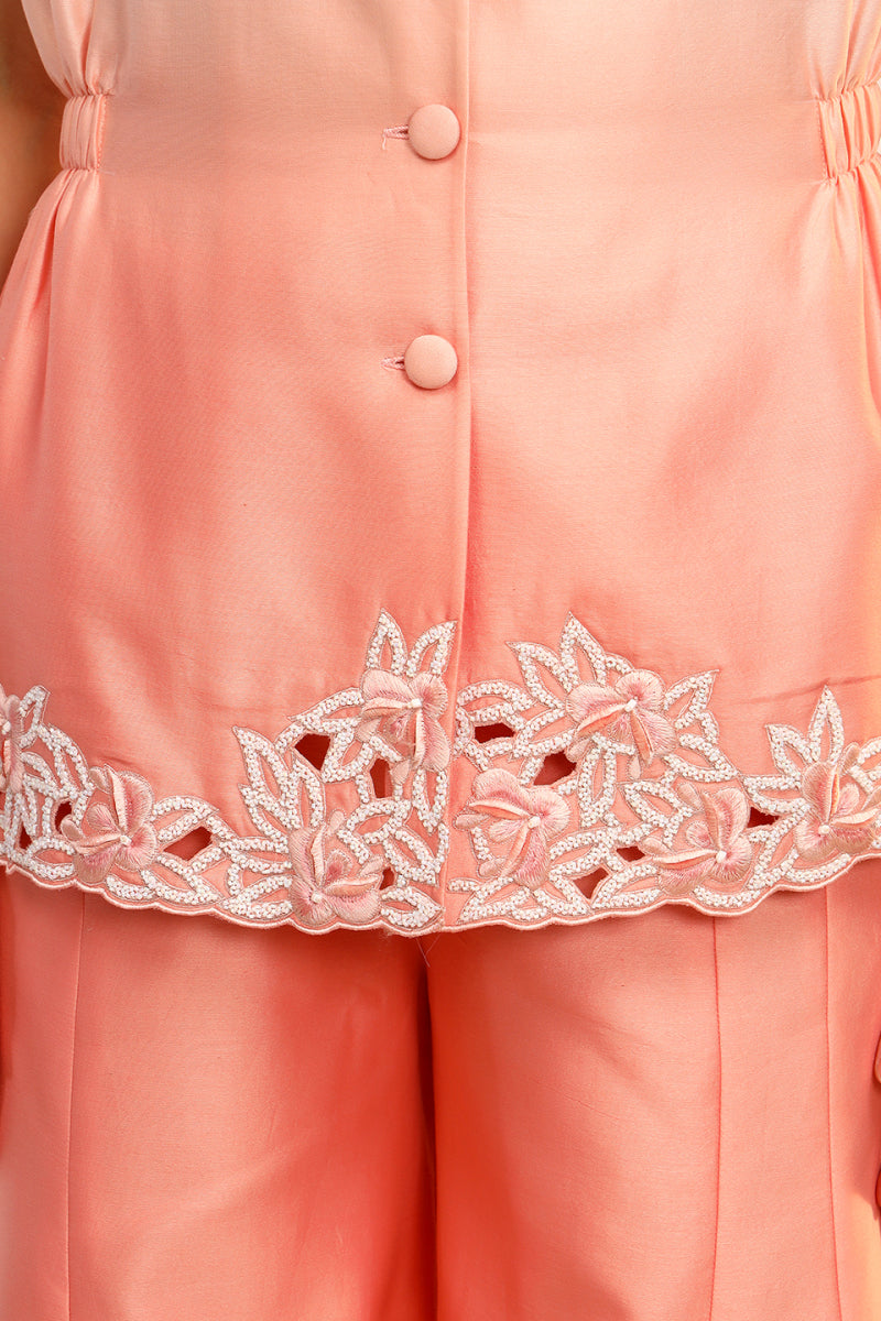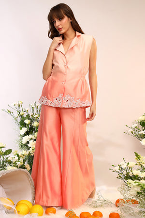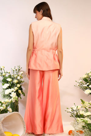 Sleeveless Blazer With Shoulder Pad, Embroidered Hem And Elastic Detailing. Paired With flared Panneled Pants and Main Fabric :- Chanderi Silk & Lining- Malmal