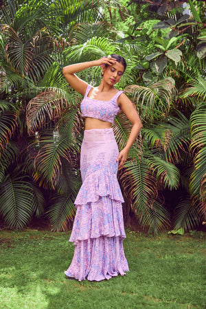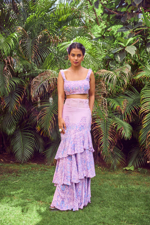 The skirt has a three tier ruffle detail complemented with an organza belt. The blouse is meticulously embroidred pearl and crystals on the print.. The ensemble has both comfort and style hand in hand making it a cluster of art, luxury in a soothing hue along with feminine silhouettes and handcrafted creations.