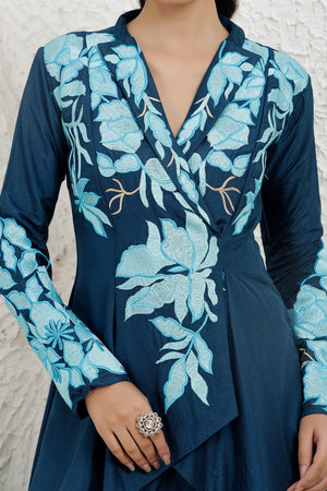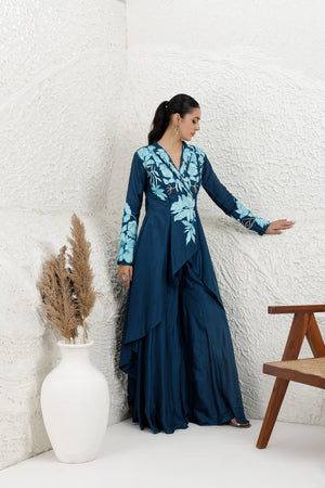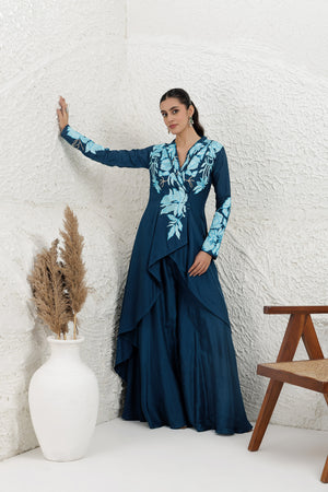 Blue high-low drees in Bemberg silk base with dual thread shade Applique and . It is paired with matching palazzo.