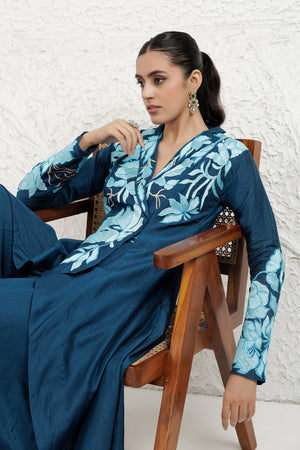 Blue Bemberg Silk Applique Embroidered High-Low Dress With Palazzo Set